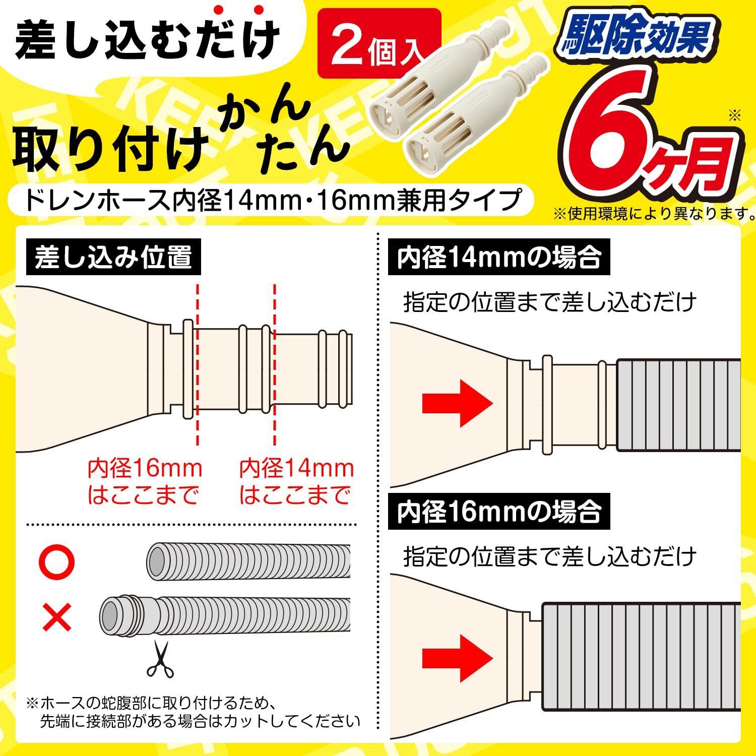 ●エアコン排水ホースに差し込むだけで簡単に取り付け可能(※ ドレンホース内径14㎜・16㎜兼用タイプ)