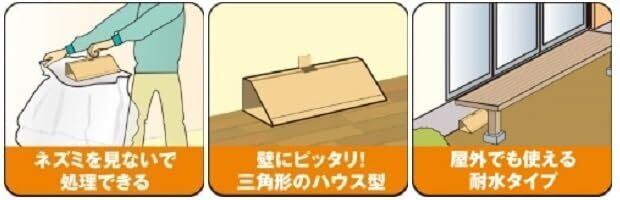 ハウス型で野外でも使用でき、捕まったネズミを直接目や手にふれる事なく処理出来ます