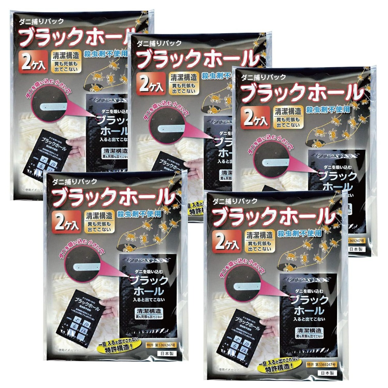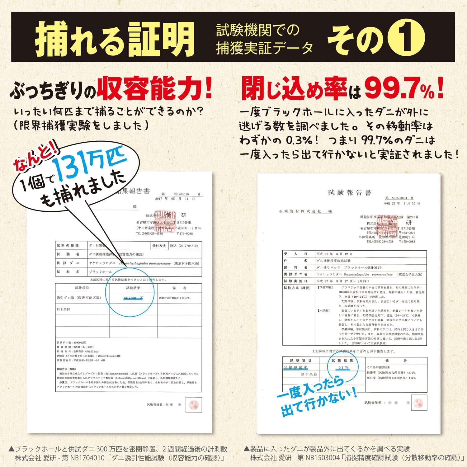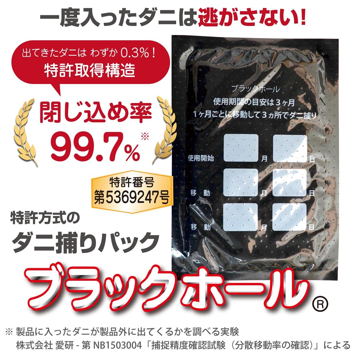 【ダニの習性を利用したダニ捕りパック】ブラックホールは明るさを嫌うダニの習性(背光性)を利用した、閉じ込め型のダニ捕りパックです。ダニの好きな香りでまとめて呼び込んで、広範囲のダニを捕獲。1か月ごとに設置場所を1m以上移動すると効果的な捕集が期待できます。