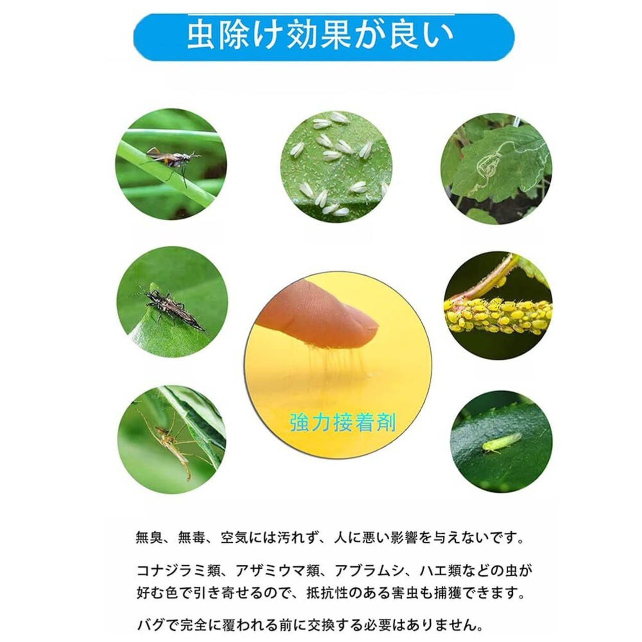 【生物学的デザイン】:害虫が惹き寄せられる色を用いて、両面粘着部分で昆虫をより効率的に捕獲します。コナジラミ類、アザミウマ類、アブラムシ、ハエ類などの虫が好む色で引き寄せるので、抵抗性のある害虫も捕獲できます。