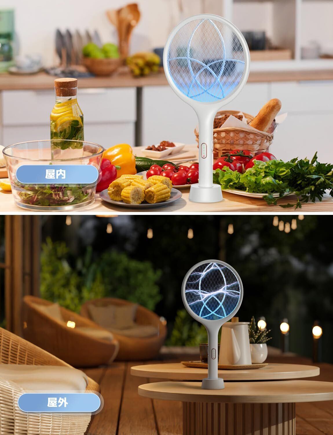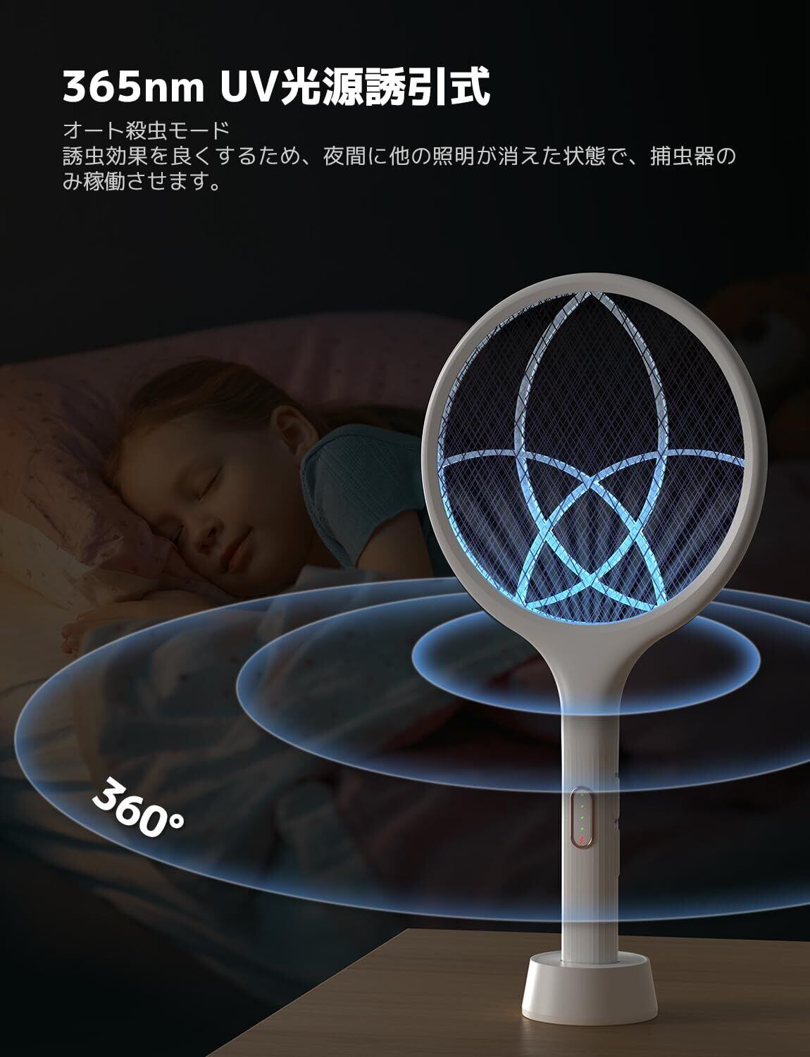 一台両役:手持ちと置き型2way使えます。取り外せるスタンド付きなので、置き型としても使えます。ラケット中央において紫外線ライトの「誘蛾灯」が点灯し、365nmUVで虫を360°引き寄せ吸い取ります。軽くて持ち運びに便利で、飛んでいる虫を即座に退治できます。