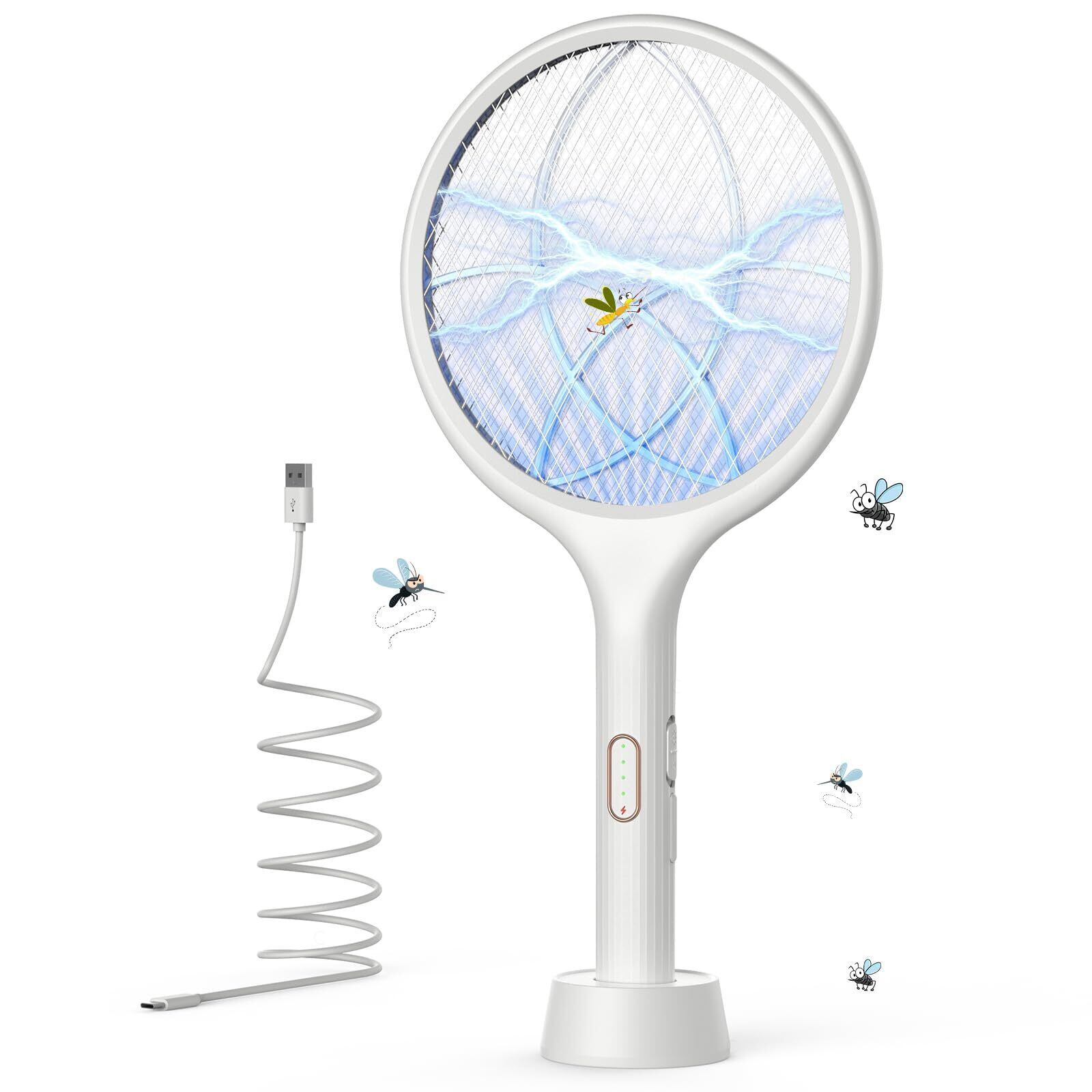【数量限定】YISSVIC 電撃殺虫ラケット 4000V高電圧で蚊取り 手持ちモード/誘引モード USB充電 スタンド付きの光源誘引式 充電式電撃殺虫器 3層構造ネット 薬剤不要で虫除け 軽くて キャップ アウトドア 屋外と屋内で使用(白)
