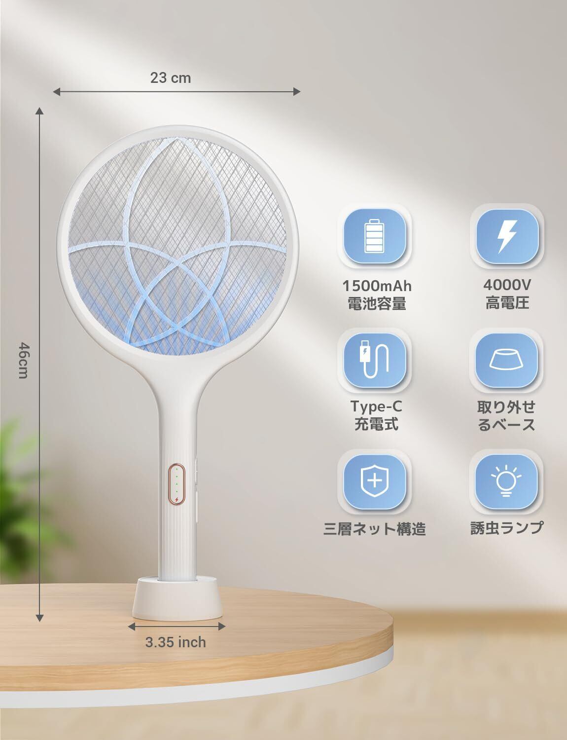 YISSVIC 電撃殺虫ラケット 4000V高電圧で蚊取り 手持ちモード/誘引モード USB充電 スタンド付きの光源誘引式 充電式電撃殺虫器 3層構造ネット 薬剤不要で虫除け 軽くて キャップ アウトドア 屋外と屋内で使用(白)