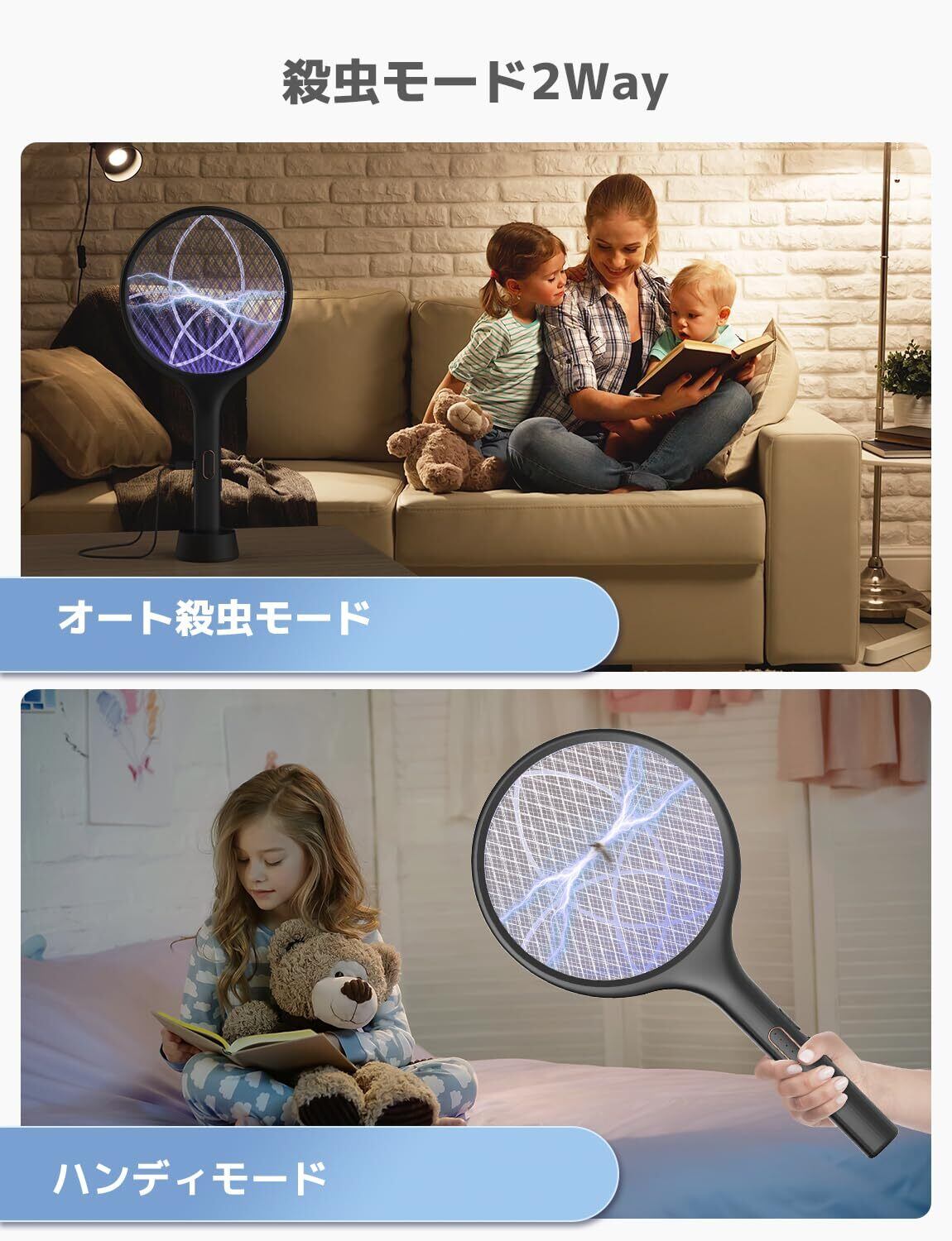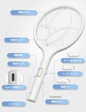 USB充電式:USB Type-C充電式で、電池を購入し続ける必要はありませんです。常時通電モードでは、充電しながら使用できます。睡眠ときの虫除けとして使用できます。電量残量表示されますので、ラケットの電量がよくわかりやすいです。約3ヶ月に一度充電をしてください。
