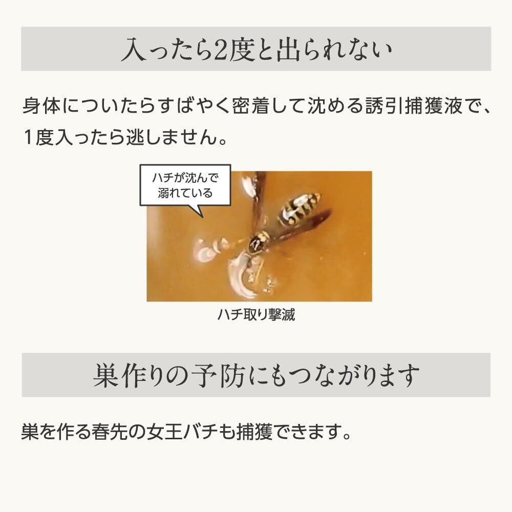 ・ハチは足場があると降り立つ習性を取り入れた形状で、身体についたら即座に密着し、すばやく沈める誘引捕獲液で1度入ったら逃さない