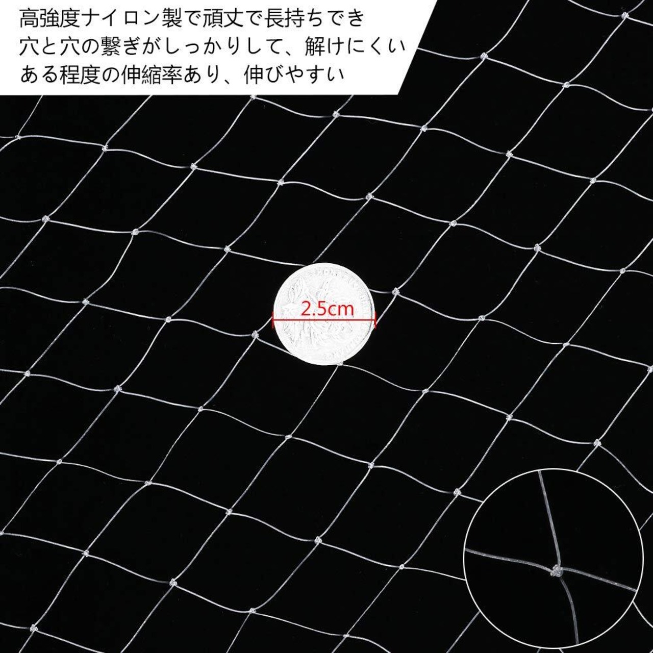 高強度ナイロンテグスの材質で軽くて頑丈です。ある程度の伸縮率があり、伸び易く、鳥が入る隙間もないようにネットを張れます。ある程度の硬さと重さがあるので、絡んでしまう恐れもありません。