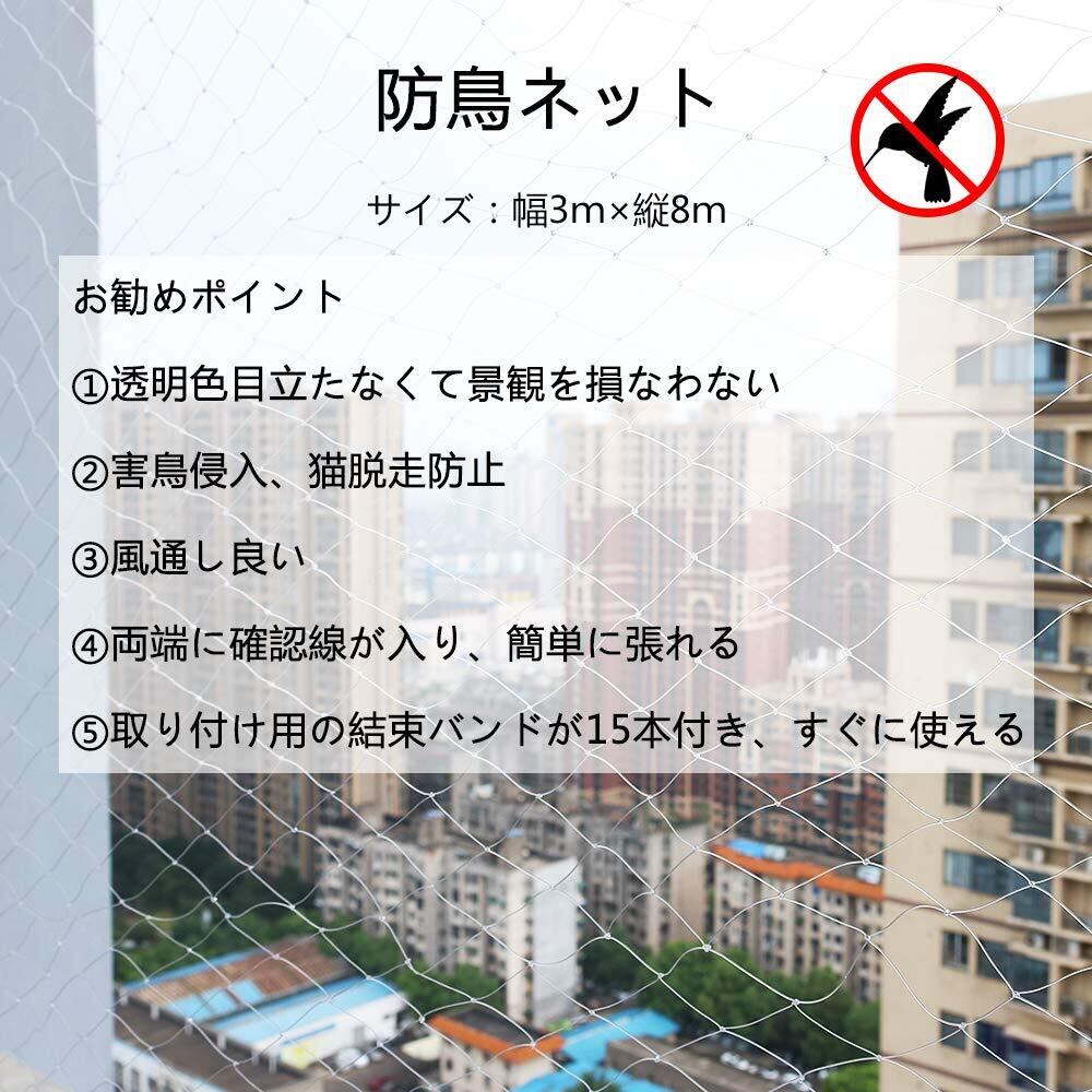 【特別価格】ベランダ 防鳥ネット 3×8m 鳥よけネット カラス 鳩 鳥害対策 防鳥防獣網 鳥除け Limthe透明色ネット(結束バンド 15本付き)