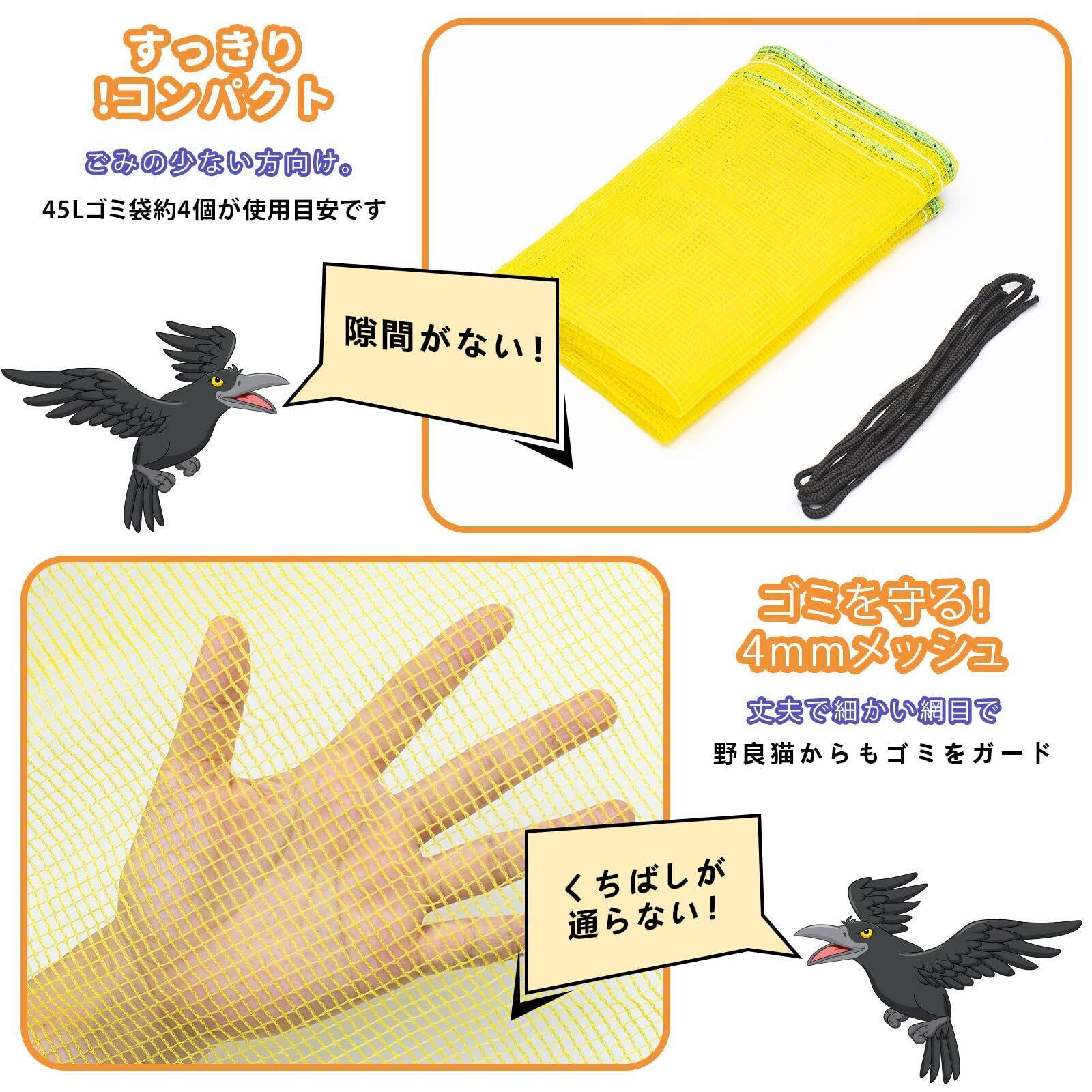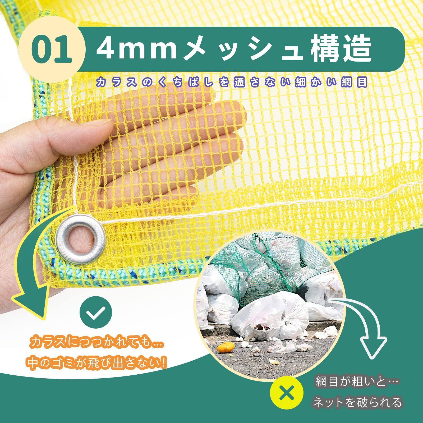約4mm網目でカラスのクチバシは入りにくく、カラス被害からのゴミ袋保護に最適なゴミネットです。取り扱い方法が簡単、ゴミの上から鳥よけネットを被せるだけ。