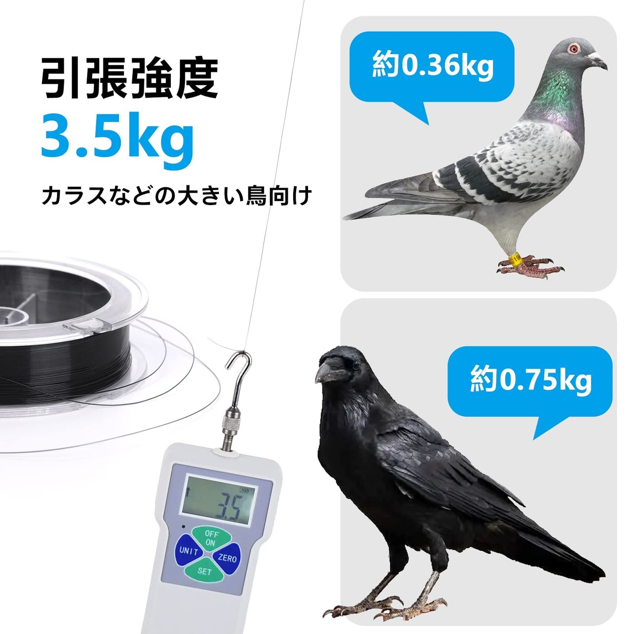 [強太防鳥てぐす] 太さ0.285mm以上のナイロン糸を採用し、強く引張ても切れません。体型が大きいカラスや鳩にも切られません。