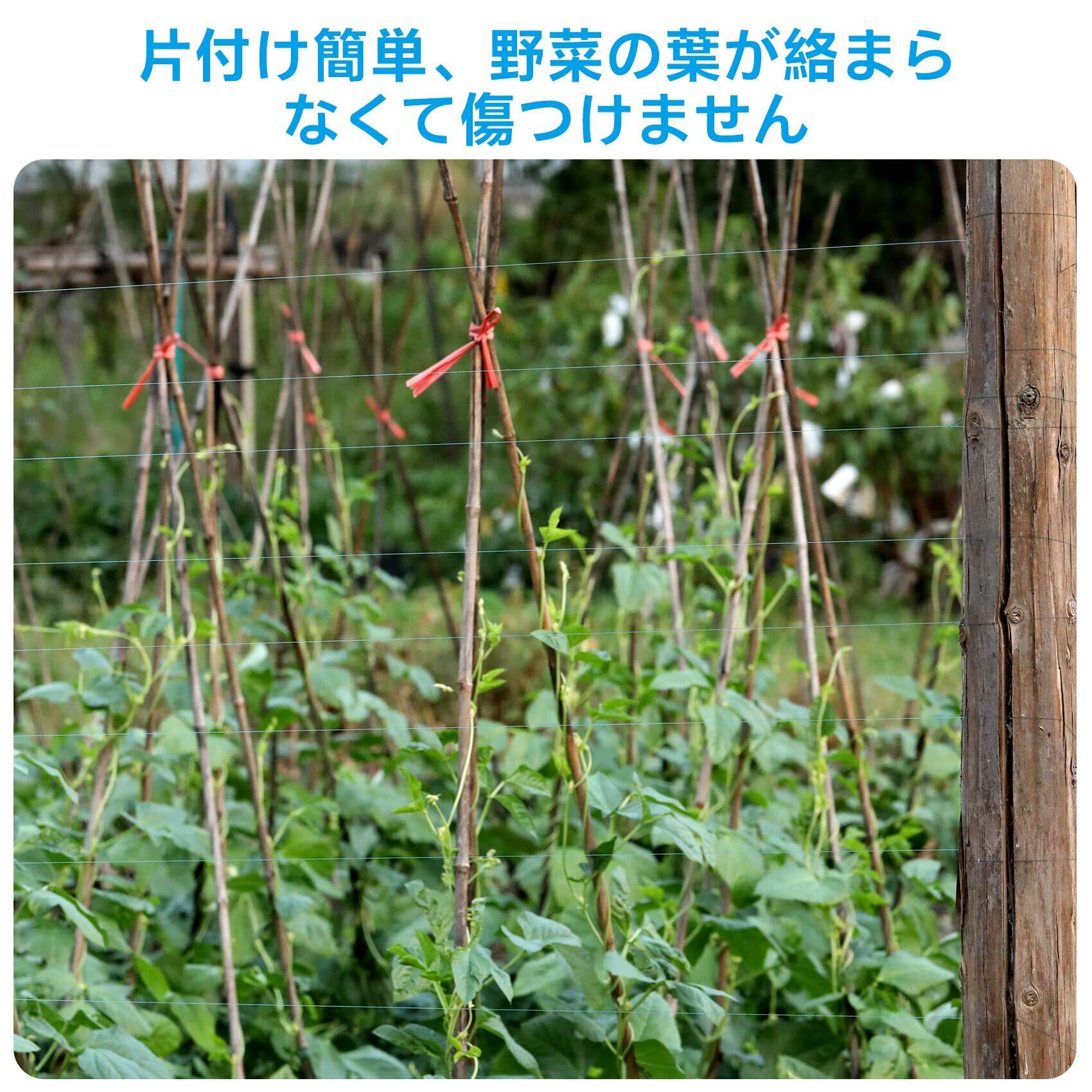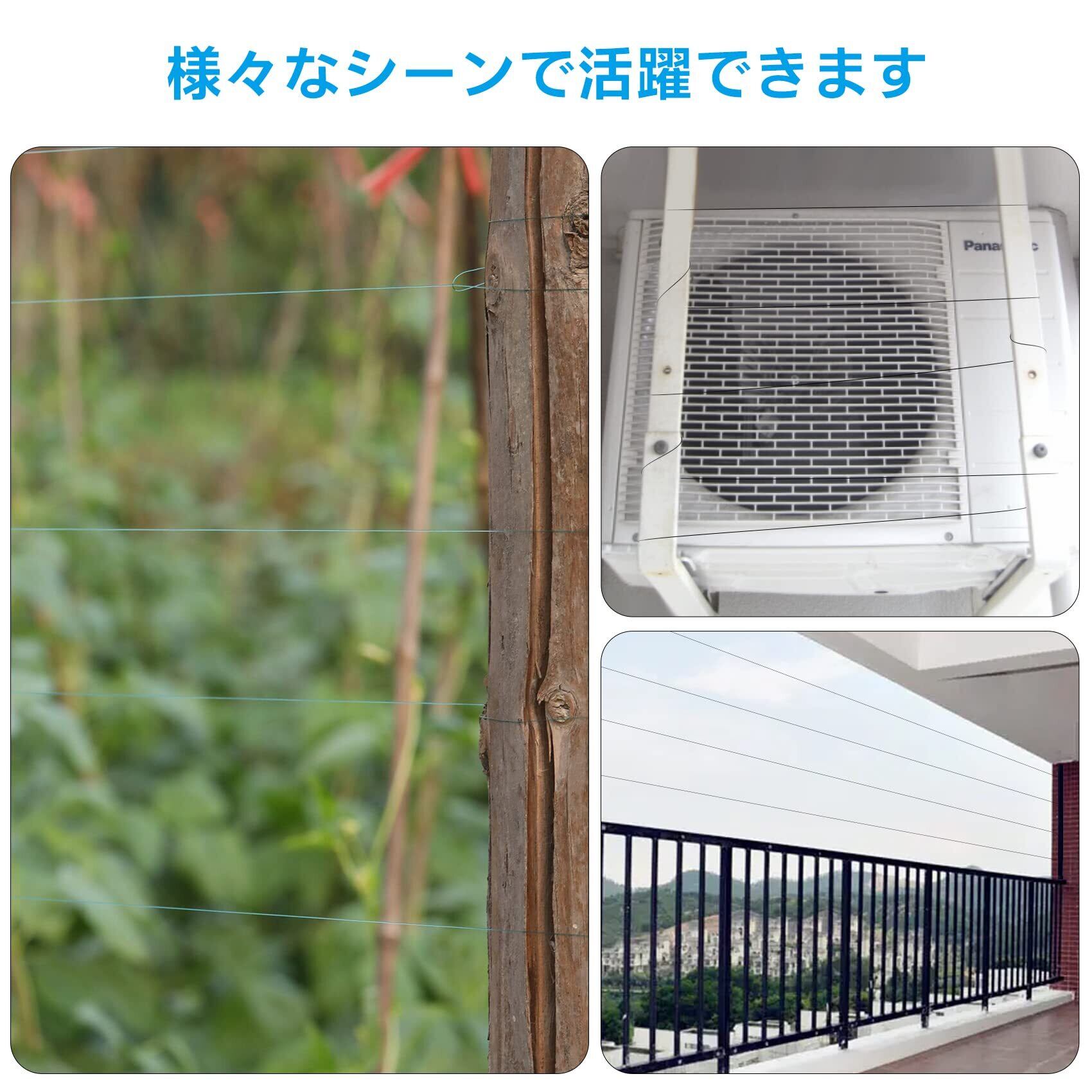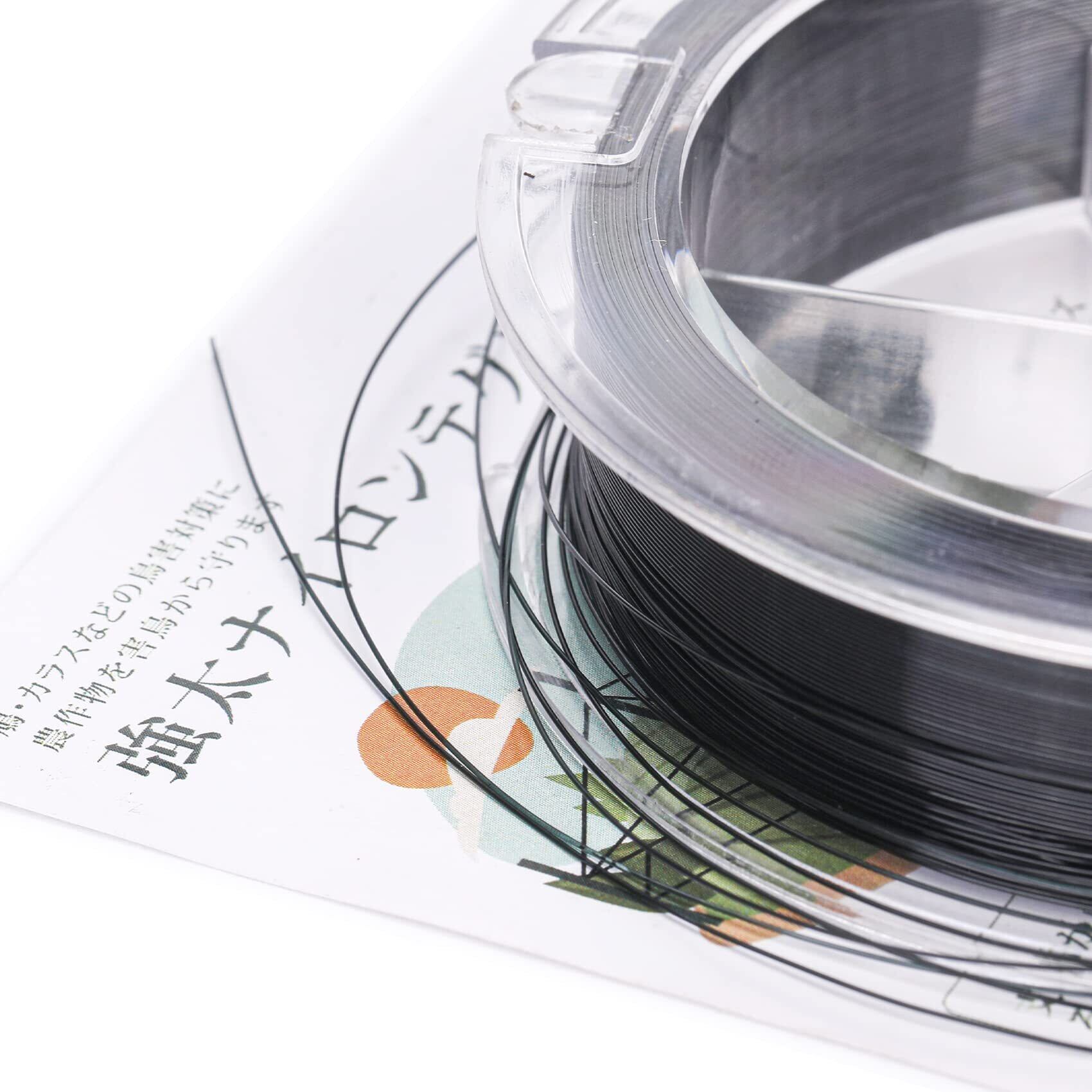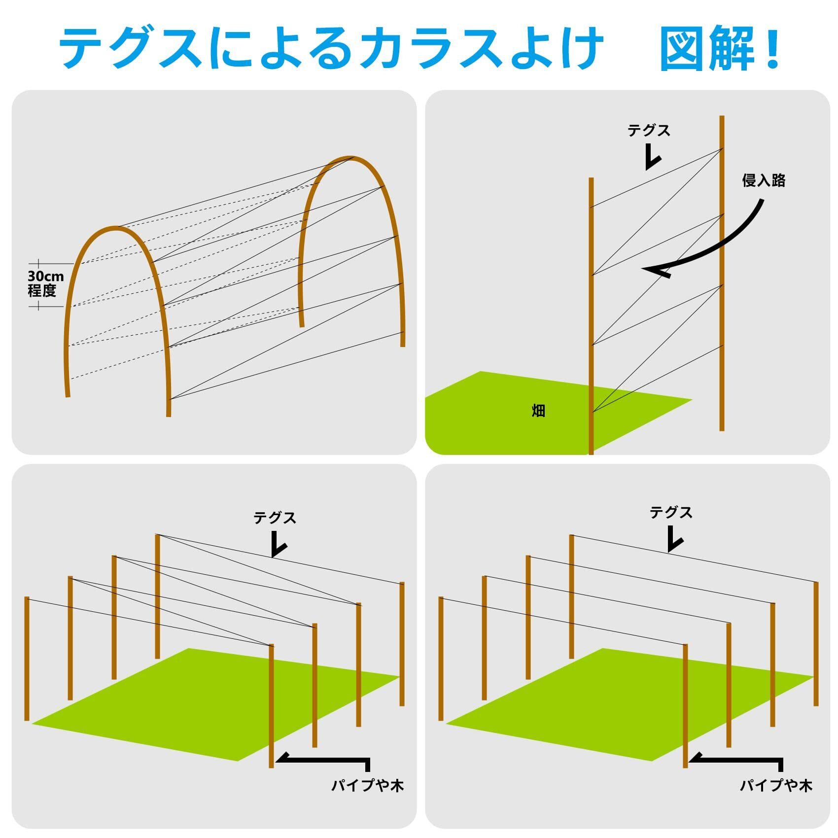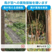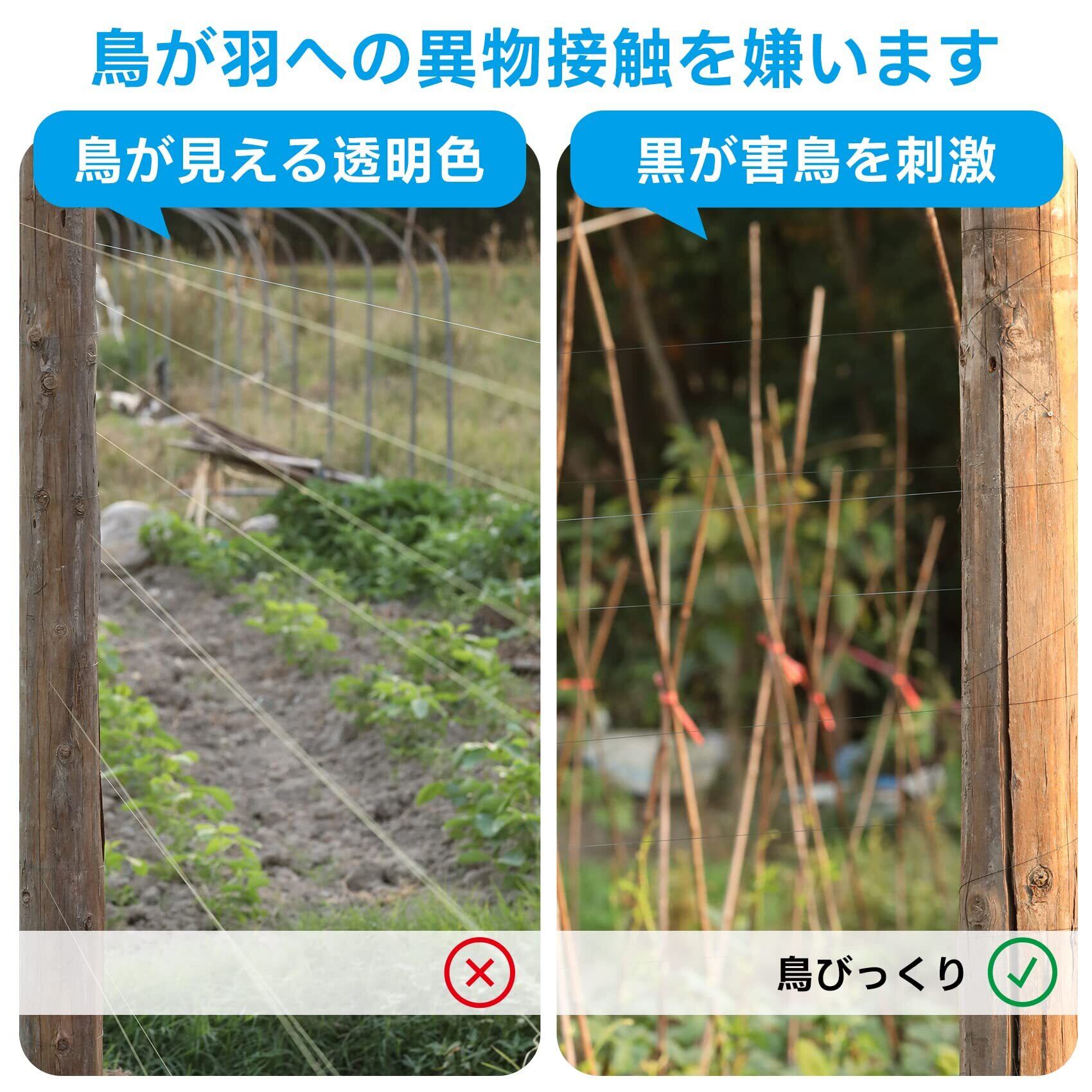 [見え隠れ黒色] 黒いテグスはある角度で見えるが、ある角度で見えないので、鳥は飛んできてくる時、羽がてぐすに触れると驚かれて飛んでいきます。透明やその他の糸であれば、鳥、特にカラスは視力がよく、透明てぐすを迂回したり、野菜畑を破壊したりすることができます。農薬とか、ケミカルなものではないので、安心です。