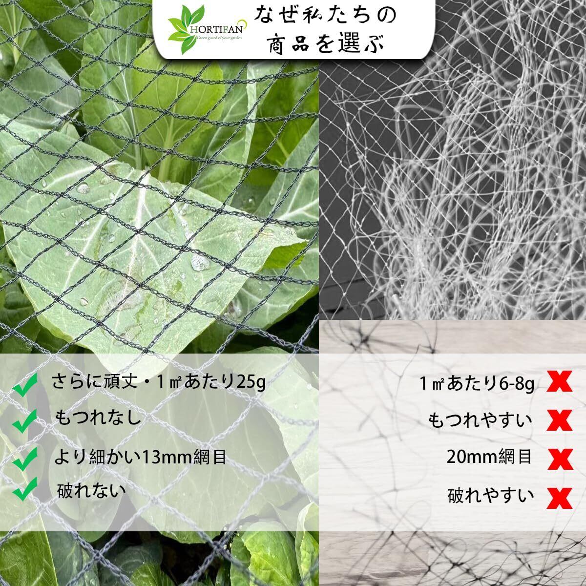 植物を傷つけないネット:簡単に設置可能。ハサミで自由にカットでき、成長する野菜や果樹を傷つけません。園芸ネットやアニマルネットとしても活用できます