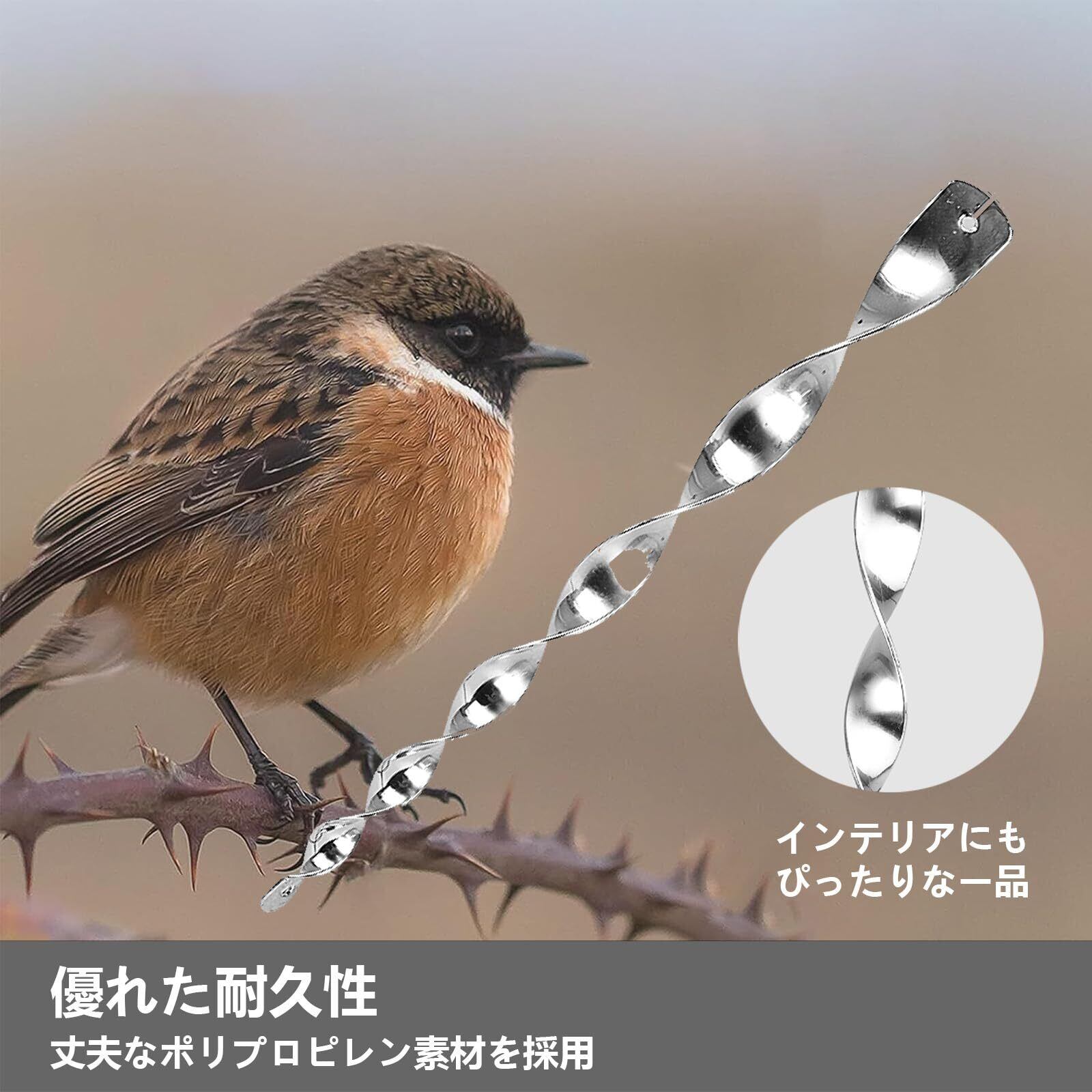 機能性・物理的に鳥たちを撃退:独特なねじれ加工によりどの面でも光を反射します。さらに風をうけてくるくる回りやすくより光を反射します。YITONGXXSUN 鳥よけ棒は太陽光を反射し鳥を遠ざけますので、鳥たちを駆除するのではなく寄せ付けない為に開発された商品です。また鳥類保護協会の要求に満足し、鳥や人に傷つけたり刺したりすることはありません。人にも鳥にも優しい鳥対策グッズです。
