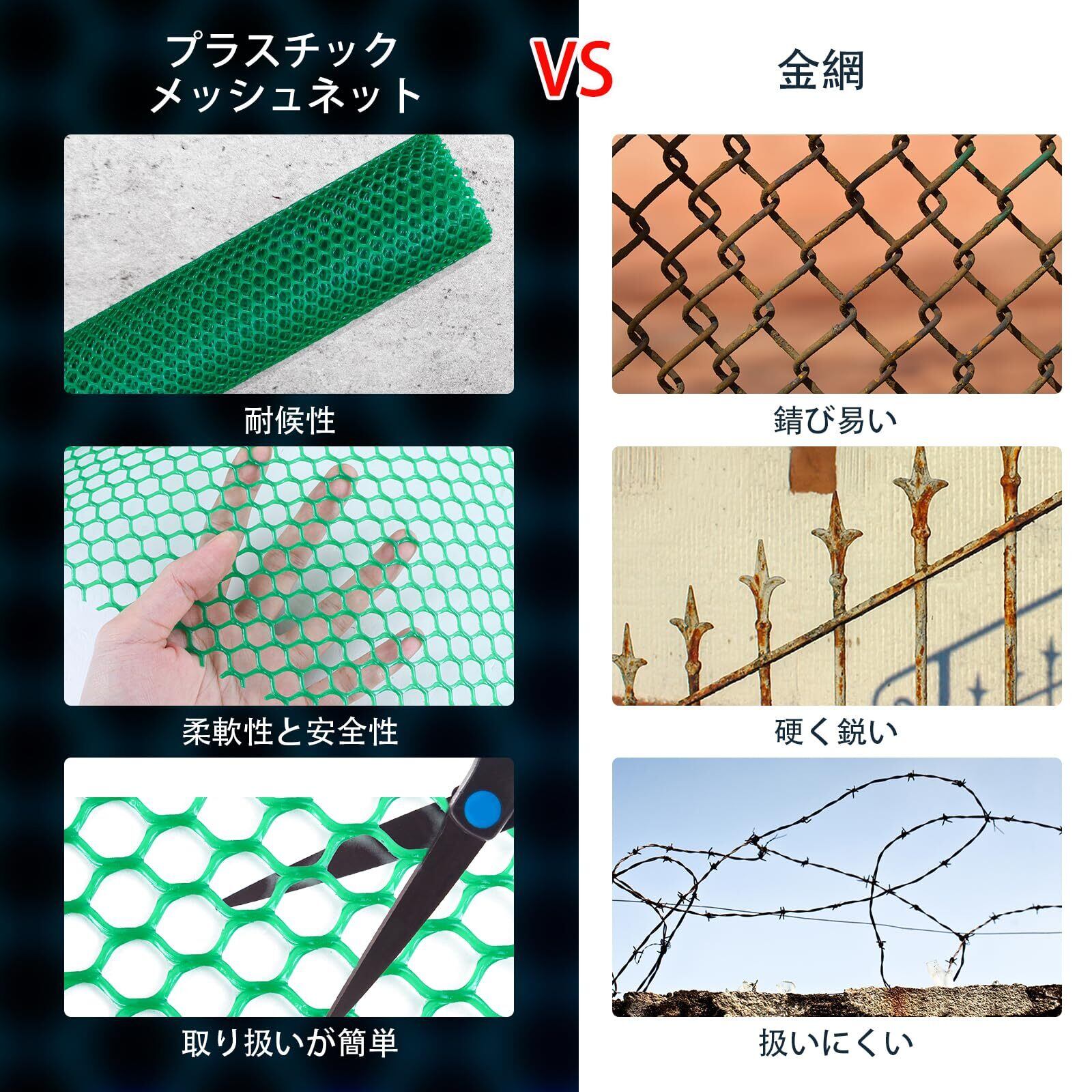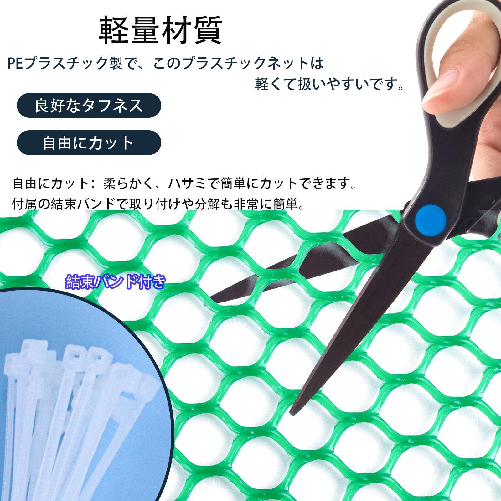 軽量材質:PEプラスチック製で、このプラスチックネットは軽くて扱いやすいです。耐久性・耐摩耗性に優れたベランダネットは、囲い込んでも通気性が良く、金網に比べてコストパフォーマンスが高いです。金属と違って水回りでも錆びず、熱に注意すれば金網の代わりにも使えます。