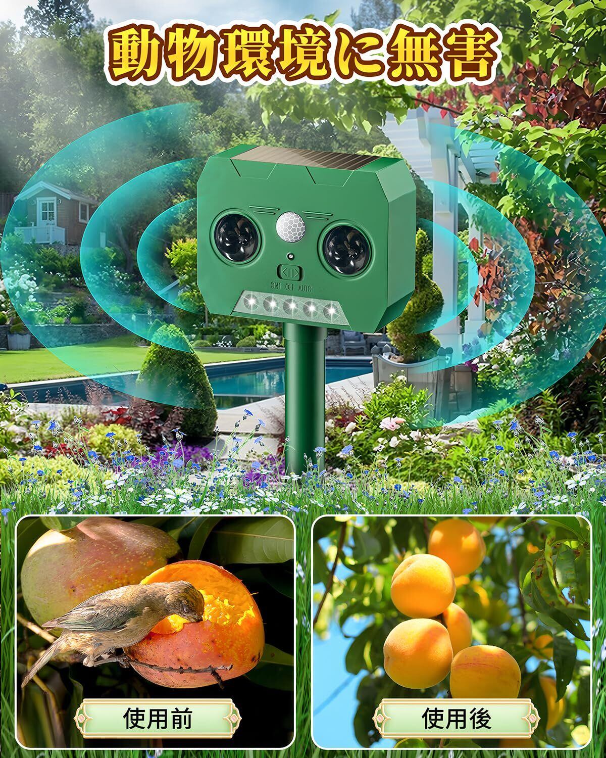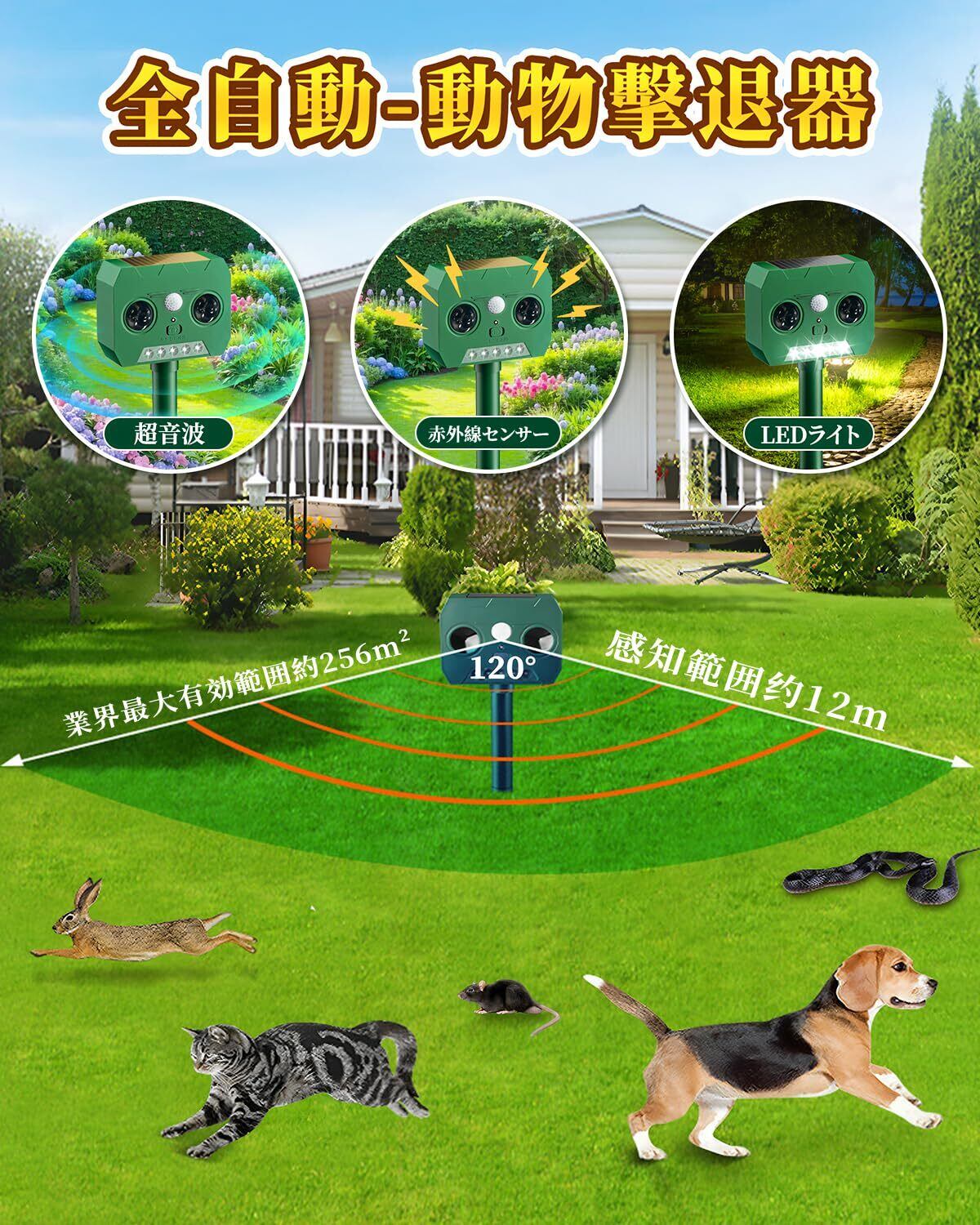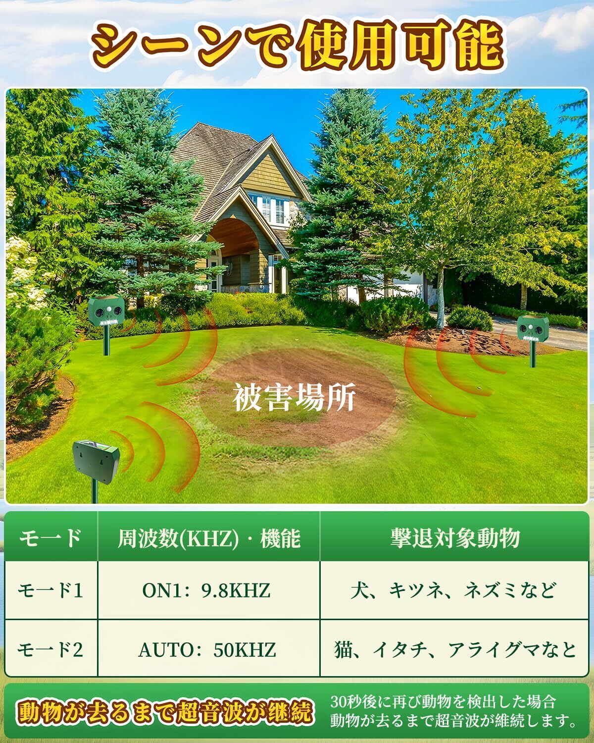 【新機能多種動物撃退】超音波で野生動物 (猫、犬、ネズミ、キツネ、鳥、げっ歯類など)が近づきません。波発振周波数は発振の都度自動的に変動し、動物の慣れを防ぎます。臭い匂いや刺激ありの忌避剤など、危険な薬剤を使用しなくて動物を傷つけずに追い払うことができます。人体、動物、環境に無害で心配なくご使用ください。
