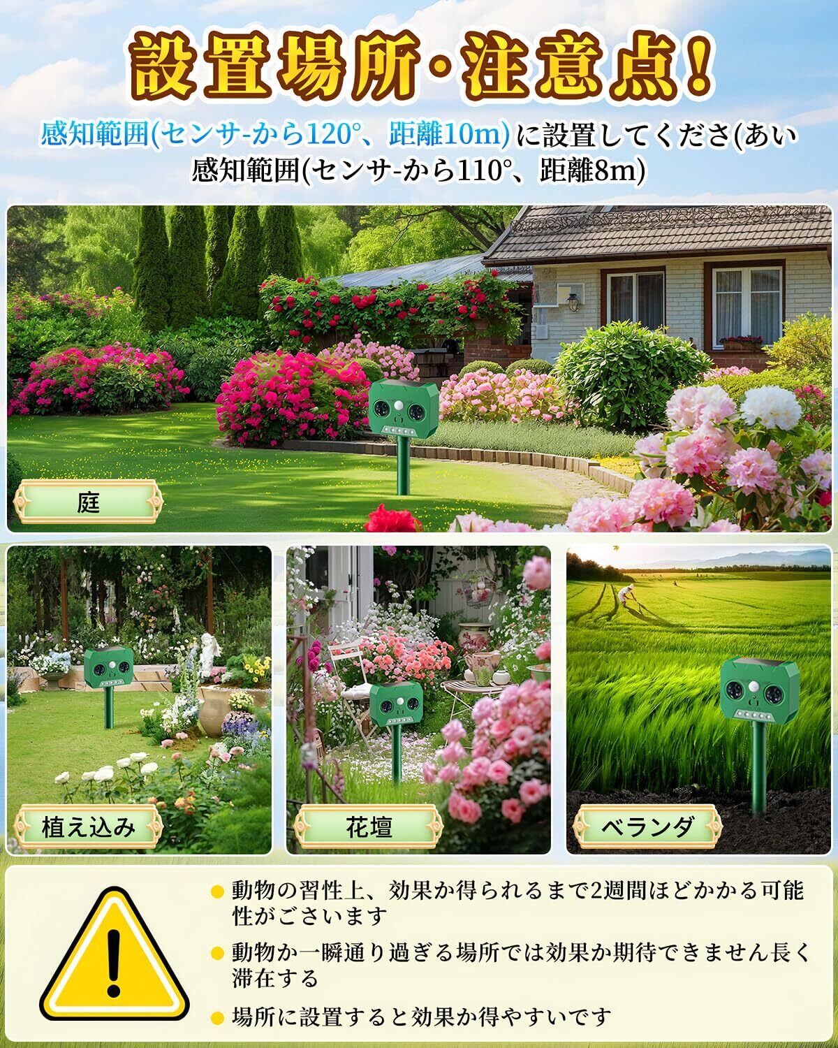 【動物を自動撃退】この猫よけは感知エリアは広くて、赤外線自動感知センサー範囲は平角度約110度、上下角度約55度で、感知距離の最大直径約12mになります。動物によって嫌いな周波数の音域が異なるため、動物撃退器から出る周波数の幅を変えることで、より多種類の動物を撃退できるということになります。