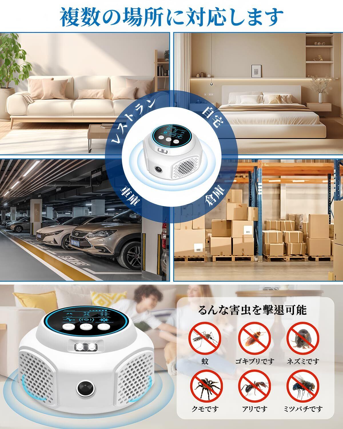 【安全性と信頼性】お子様や妊婦のご家庭では、化学品やスモッグ、スプレーなどの使用が心配になるかもしれません。害虫駆除装置は化学品を使用していません。有害物質を排出しません。子供や妊婦にも安全です。発せられる超音波は、害虫の生活環境を物理的に破壊し、害虫とネズミだけに影響を与えます。