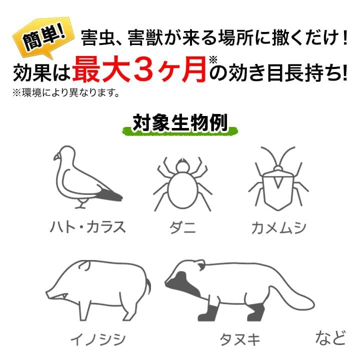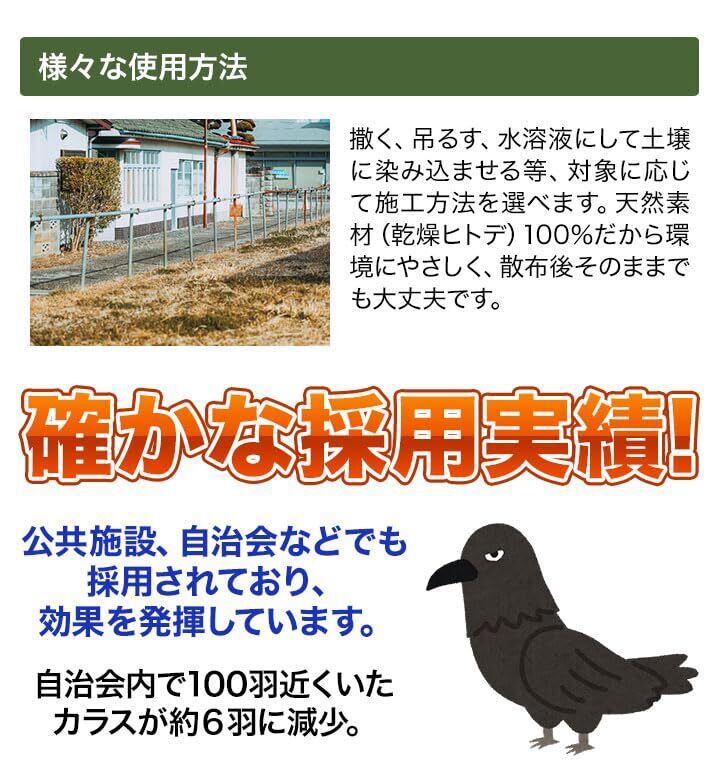 セット内容/ 【2袋】本品×2袋 【6袋】本品×6袋 1袋:約500g ※使用目安:1坪あたり約150g ※6袋で合計約20坪(66平方メートル)分 原料/天然乾燥ヒトデ 成分/ヒトデサポニン 効果/最大約3ヶ月(環境により異なる) 使用推奨場所/ ●ベランダなどの害鳥対策 ●ごみステーションなどのカラス対策 ●駅舎・倉庫・物置・体育館などの営業対策 ●ビル・マンション・高架下などの鳩・コウモリ対策 ●電力会社・電柱への営巣対策 対象生物/ 【害獣】シカ、イノシシ、クマ、サル、ハクビシン、アライグマ、イタチ、キツネ、タヌキ、ネズミ、カラス、ハト、ムクドリなど 【害虫】ムカデ、ダニ、カメムシ、ヤブ蚊など 注意事項/本品は食品ではありません。絶対に食べないでください。 幼児の手の届く所には置かないで下さい。