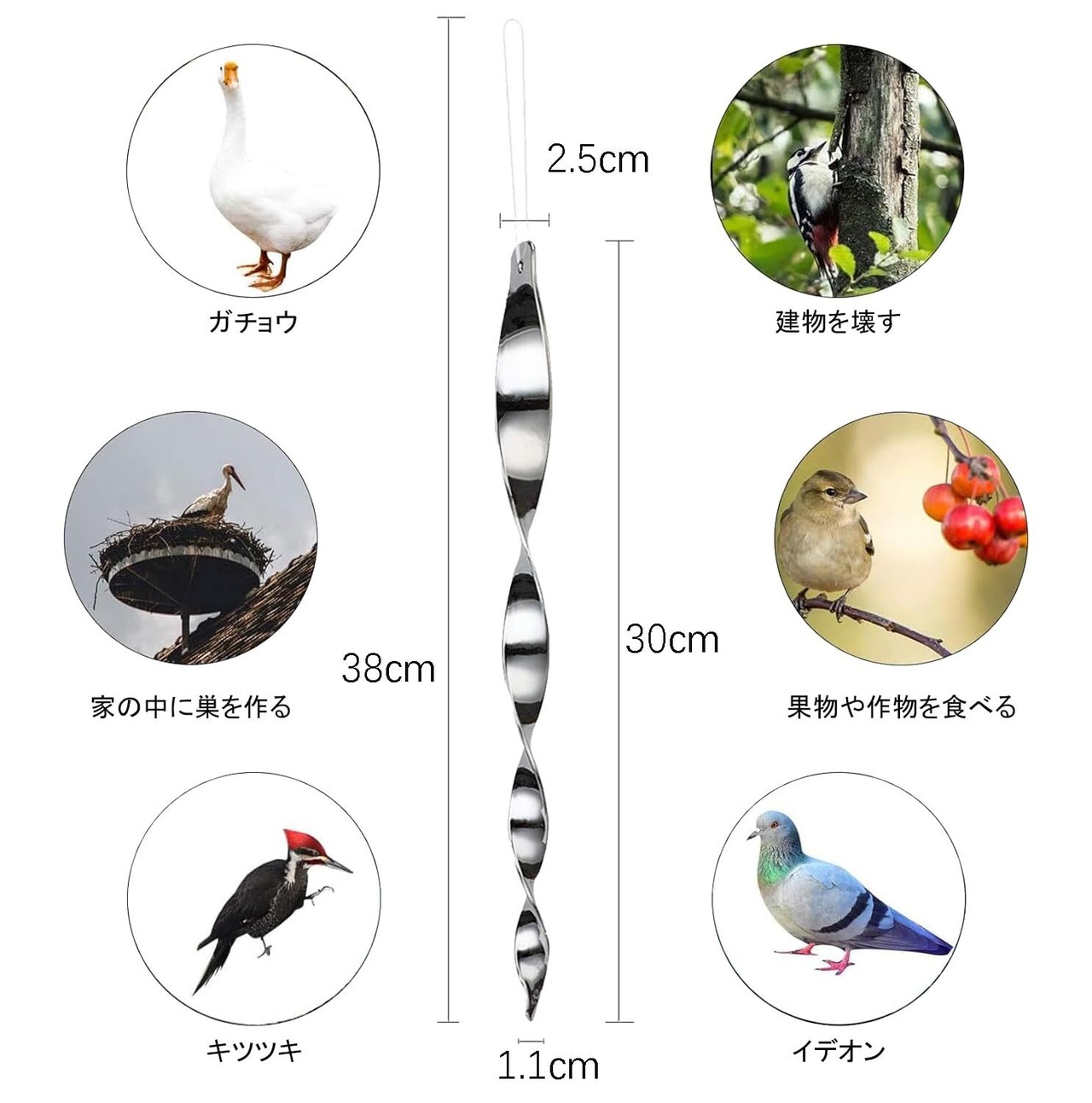 6本セットで広範囲カバー:1本の長さは約30cm、6本セットで広い範囲に対応。家庭用から業務用まで幅広く使えるコストパフォーマンス抜群のすずめよけグッズです。