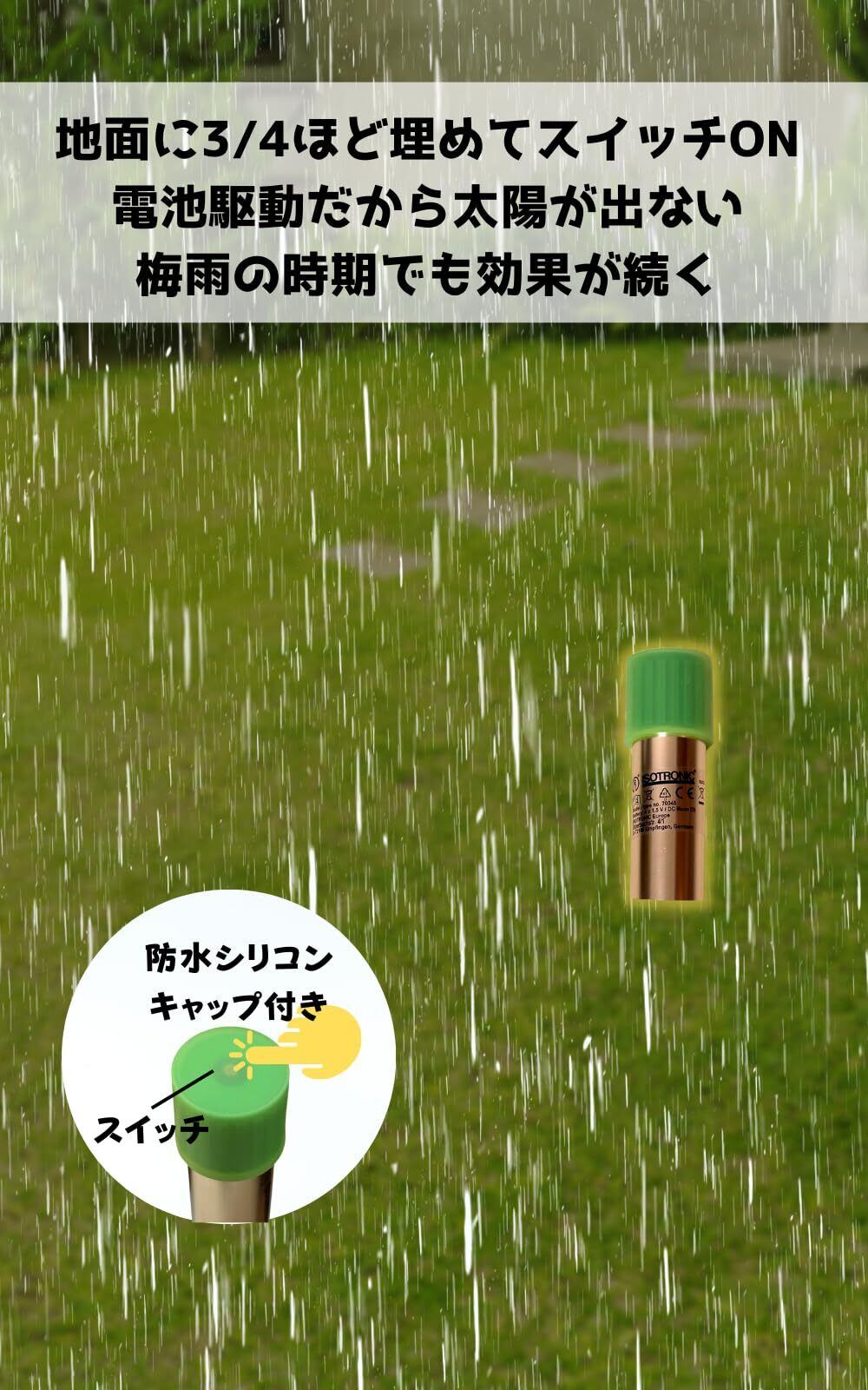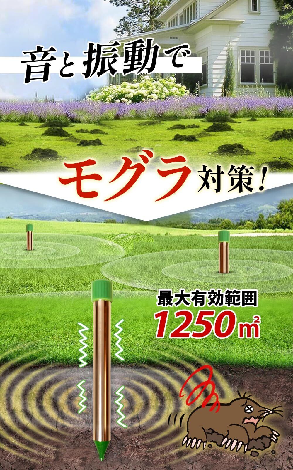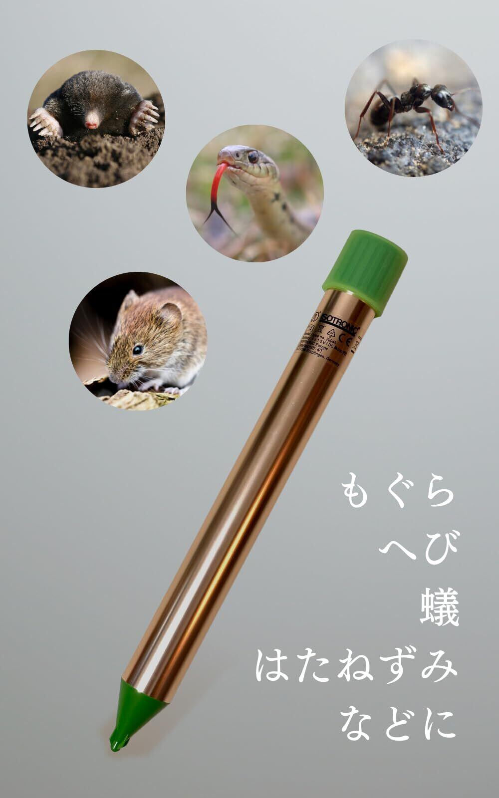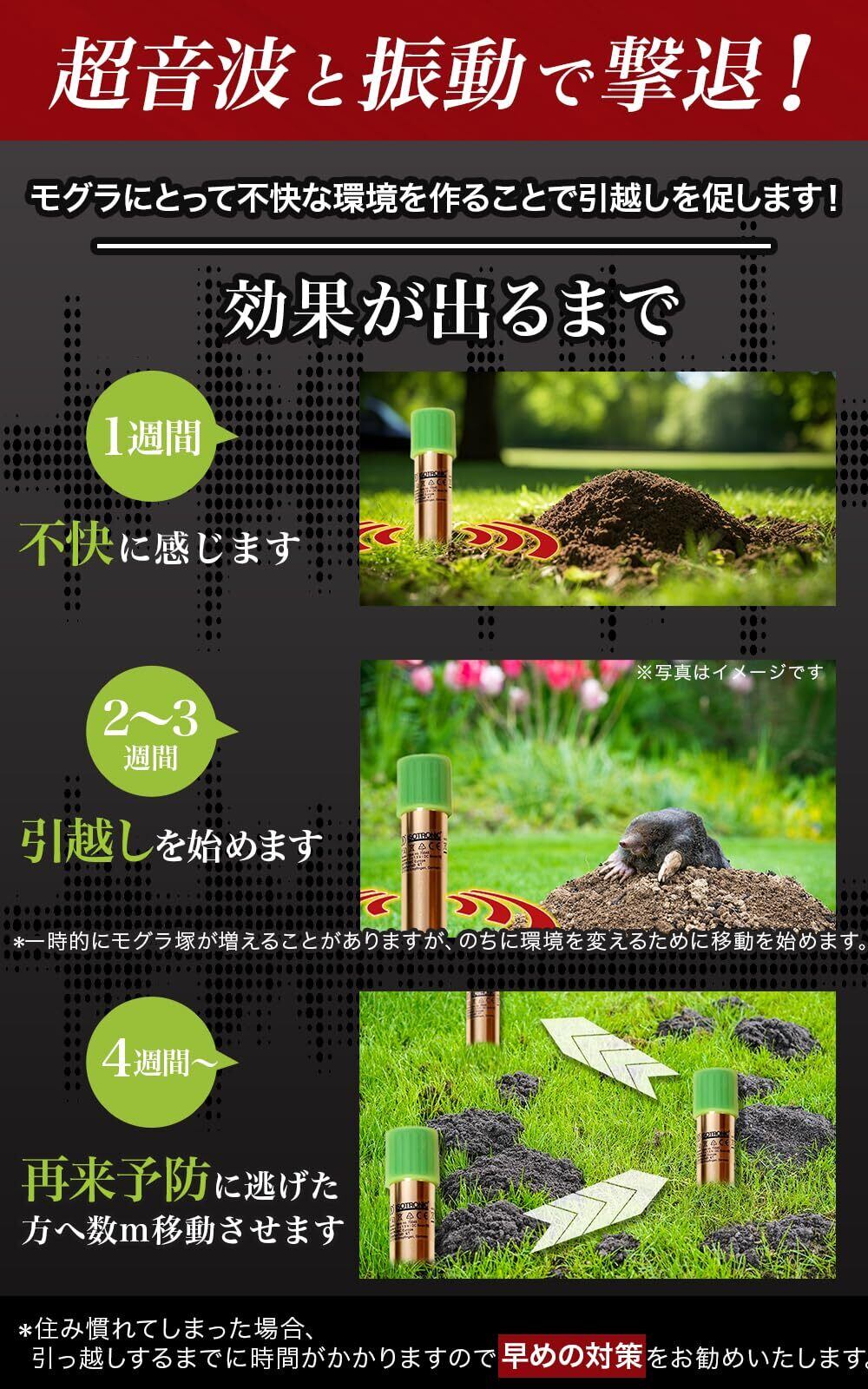 超音波と周波数振動を交互に発生させるもぐら撃退器。もぐら、ハタネズミ、ヘビを退治