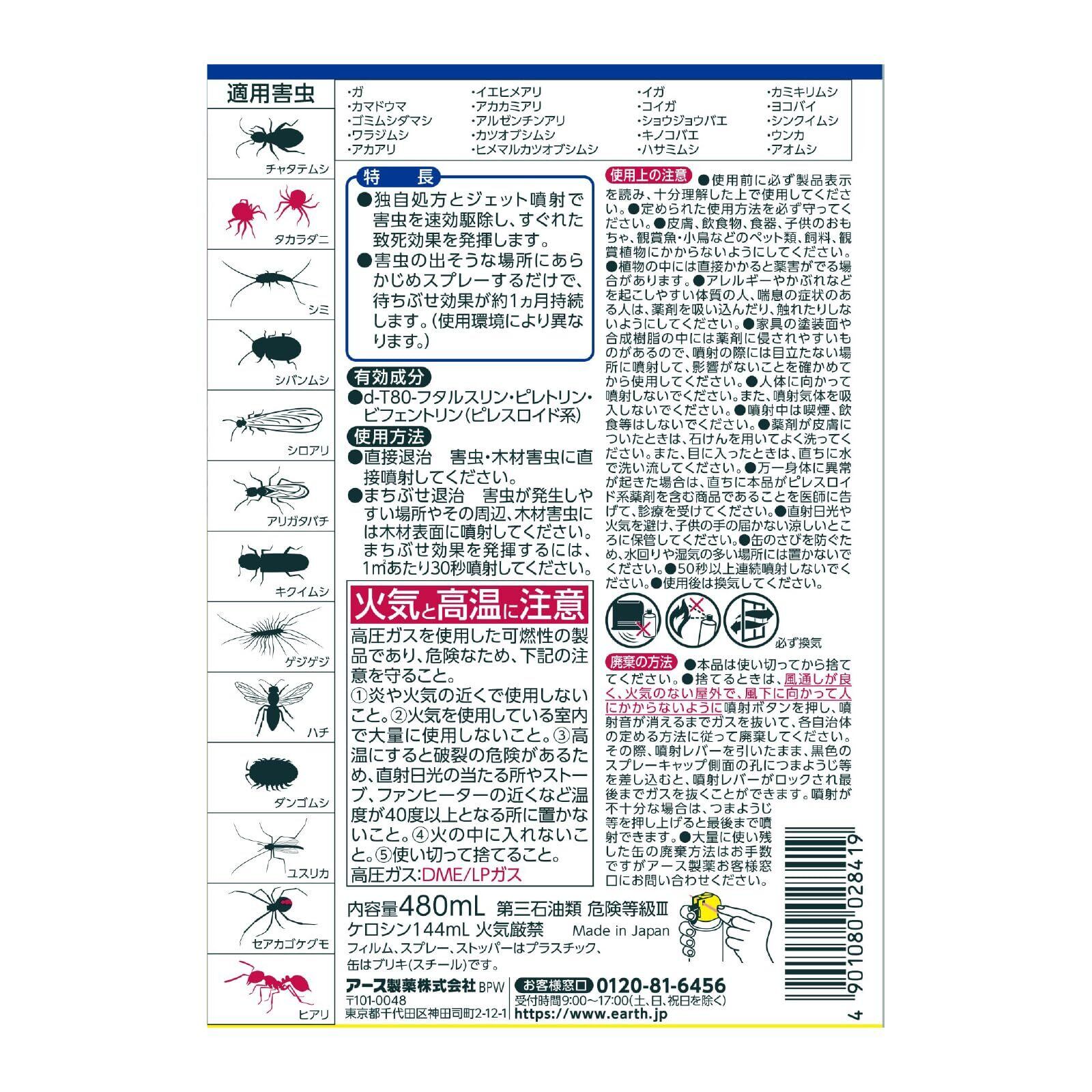 【適用害虫】ムカデ、ケムシ、クロアリ、クモ、ヤスデ、カメムシ、チョウバエ、アブ、ブユ、チャタテムシ、タカラダニ、シミ、シバンムシ、シロアリ、アリガタバチ、キクイムシ、ゲジゲジ、ハチ、ダンゴムシ、ユスリカ、セアカゴケグモ、ヒアリ、ガ、イエヒメアリ、イガ、カミキリムシ、カマドウマ、アカカミアリ、コイガ、ヨコバイ、ゴミムシダマシ、アルゼンチンアリ、ショウジョウバエ、シンクイムシ、ワラジムシ、カツオブシムシ、キノコバエ、ウンカ、アカアリ、ヒメマルカツオブシムシ、ハサミムシ、アオムシ