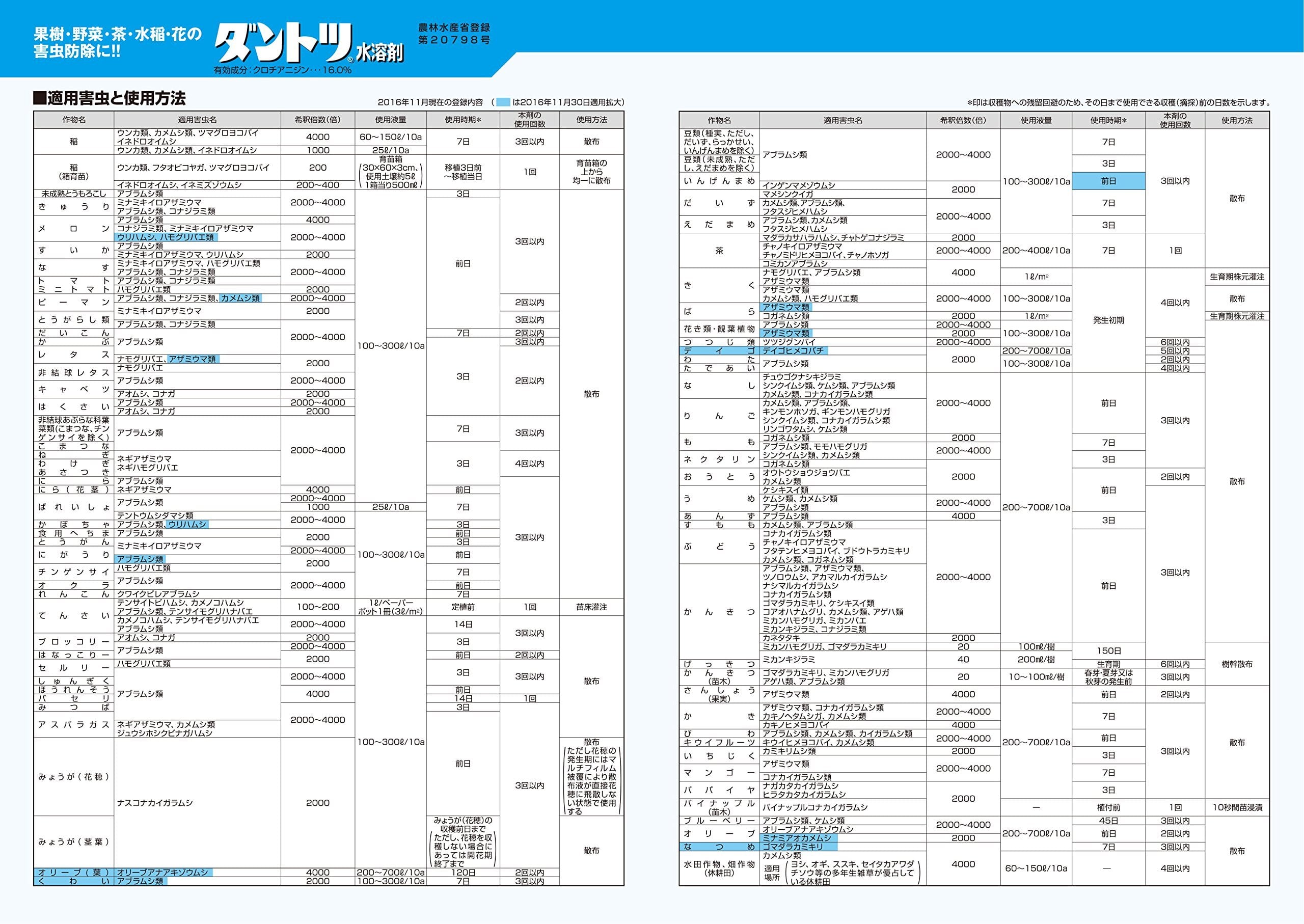※ぶどうに使用する場合、袋かけ前までの幼果期に散布すると品種によっては果粉が溶脱するおそれがあるので注意してください。