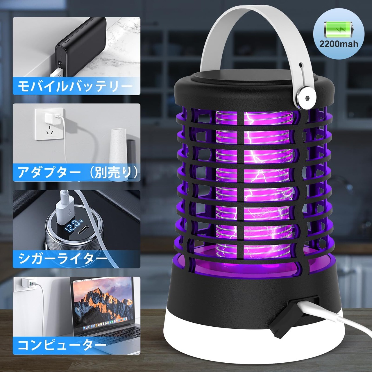 【大容量バッテリー内蔵・3つのライトモード】本電撃殺虫器は2200mAhの大容量充電可能バッテリーを内蔵して、製品が長時間使用できることをさせます。 5V汎用のUSB-Aタイプケーブルを付属して、携帯電話充電器、ノートパソコン、車のシガーライターから製品に充電可能です、非常に便利です。白色光、暖色光、SOS赤色ヘルプコールライトという3つのLEDライトモードがあり、フィールドで危険の場合には、タイムリーに助けを求めることができます。