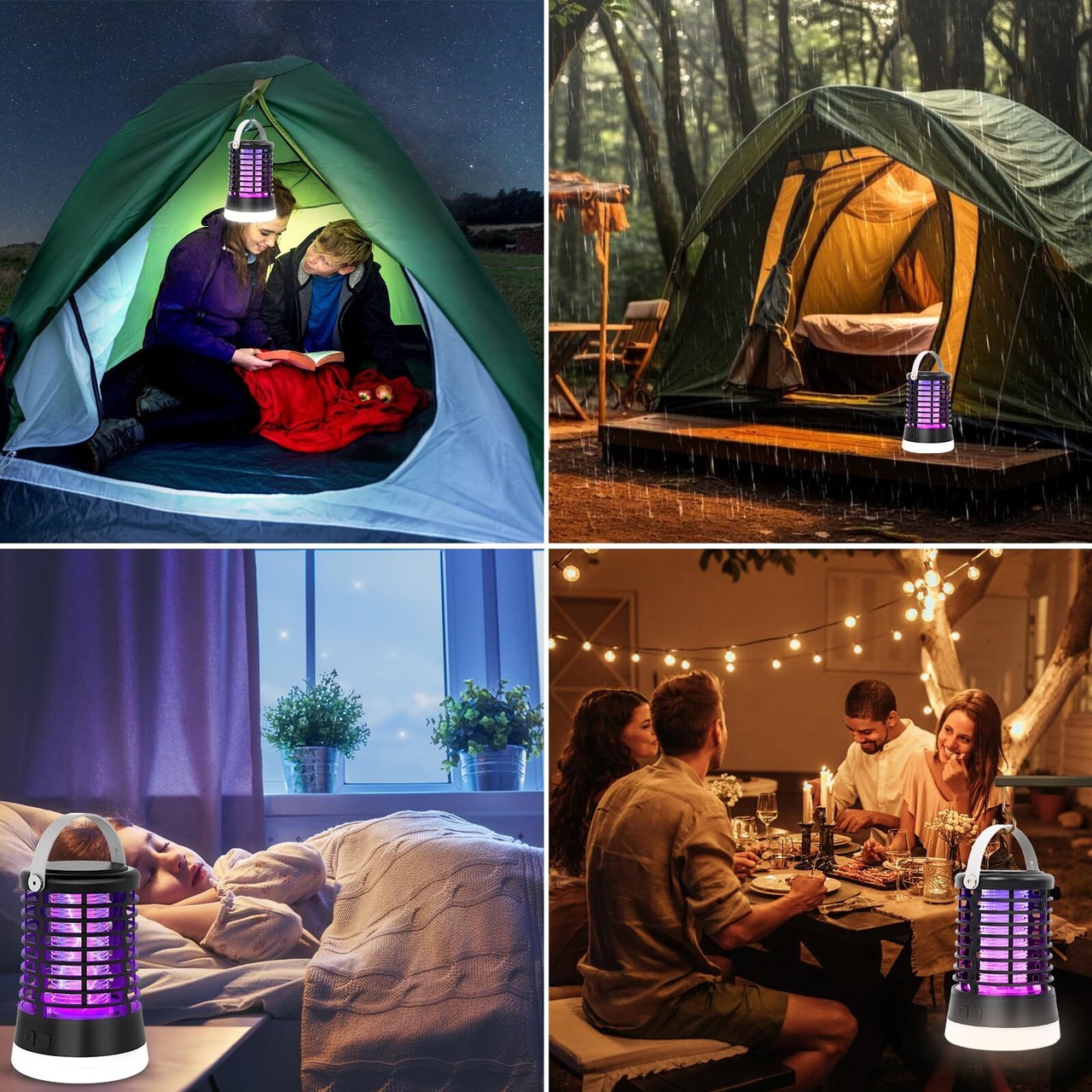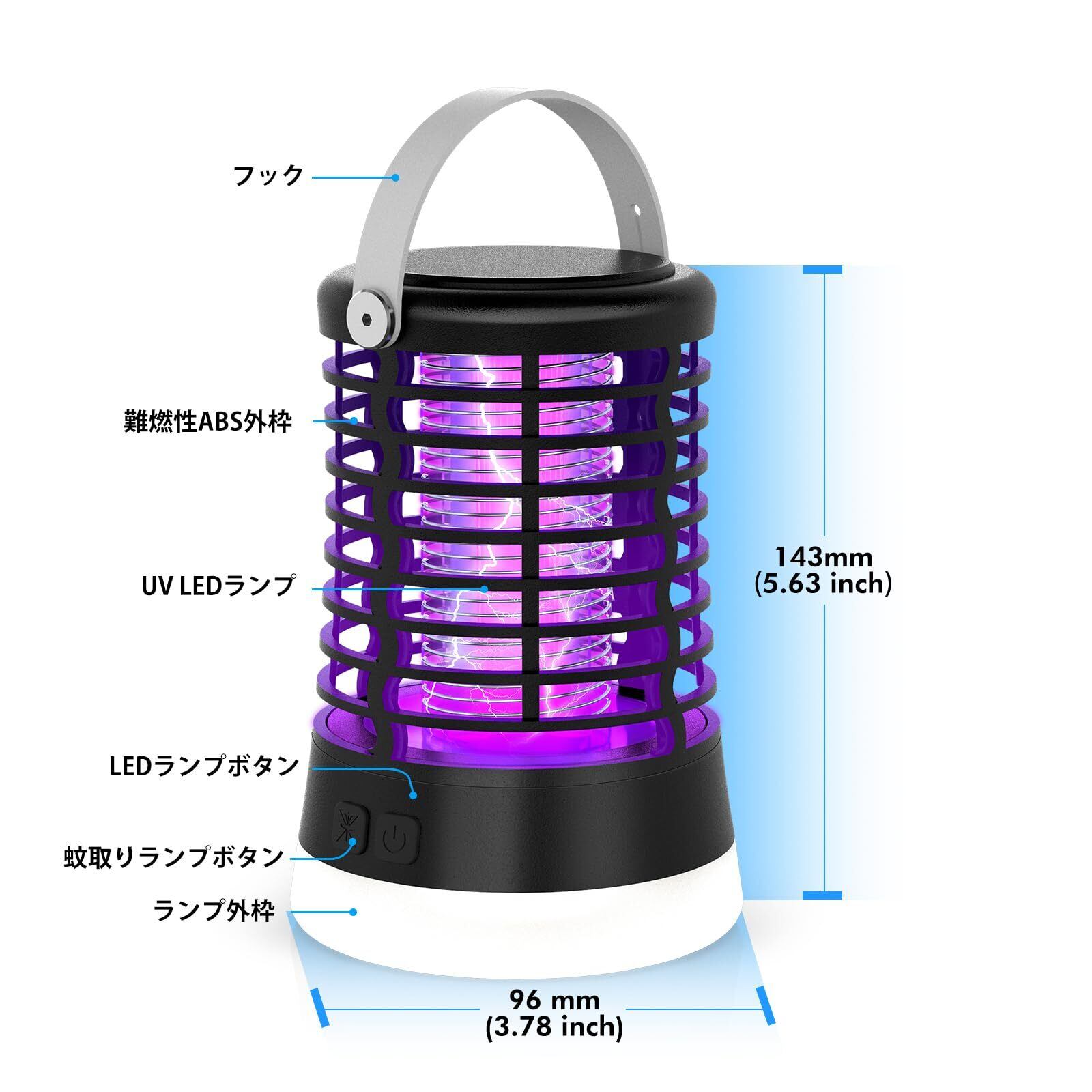 【置き&掛け両用・静かで省エネ】UV光源を使用して蚊を退治ために、運転する時に騒音が出さない、目に優しい光なので、睡眠に邪魔ならない。 製品自体にフックが付き、デスクトップに平置きして使用することができ、テント、パティオの出入り口など場所にも吊り下げて使用することができ、屋内や屋外両対応の蚊ライトです。製品にはLEDライトが付属しており、夜に照明使用することができ、大容量バッテリーで長時間使用することを確報し、屋外での使用に最適です。