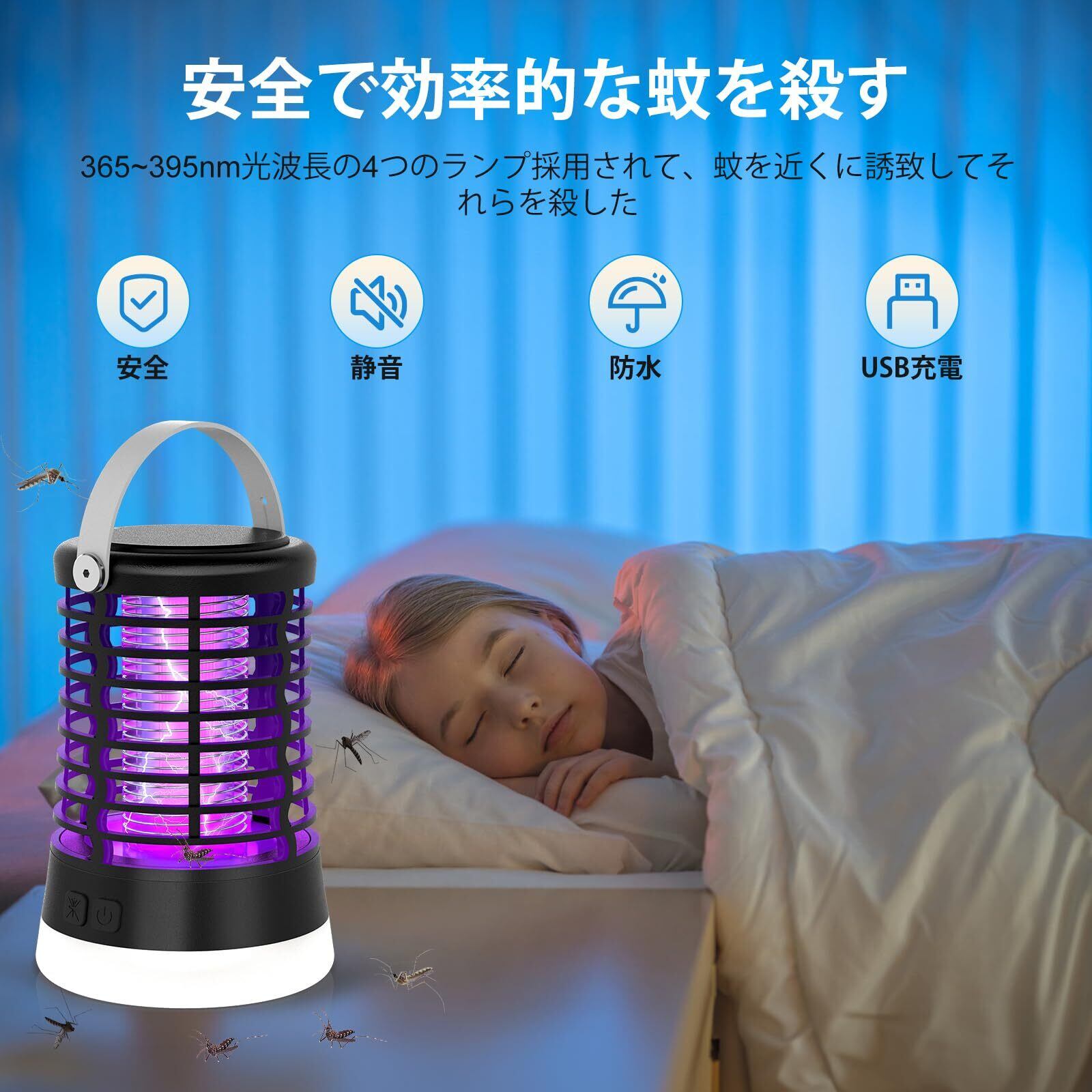 【360°全方位UV光源・安全で効率的な蚊を殺す】蚊や他の害虫が好きな光の波長を採用された電撃蚊取り器です、安全かつ効率的に蚊の近くに誘致し、それらを殺すことができます。薬剤や蚊取り線香など伝統的な蚊を撃退する手段のように煙や臭いを生成しません、妊婦や赤ちゃんやペットにもがいるご家庭でも安心です。外枠には難燃性ABS素材を使用し、密なグリッドデザインで、お子供の安全を守ります。