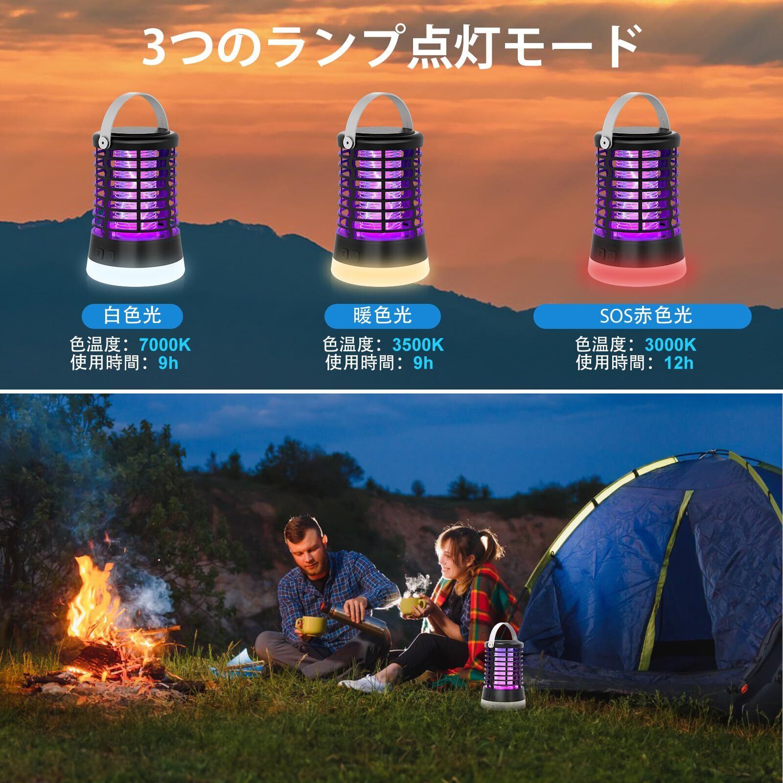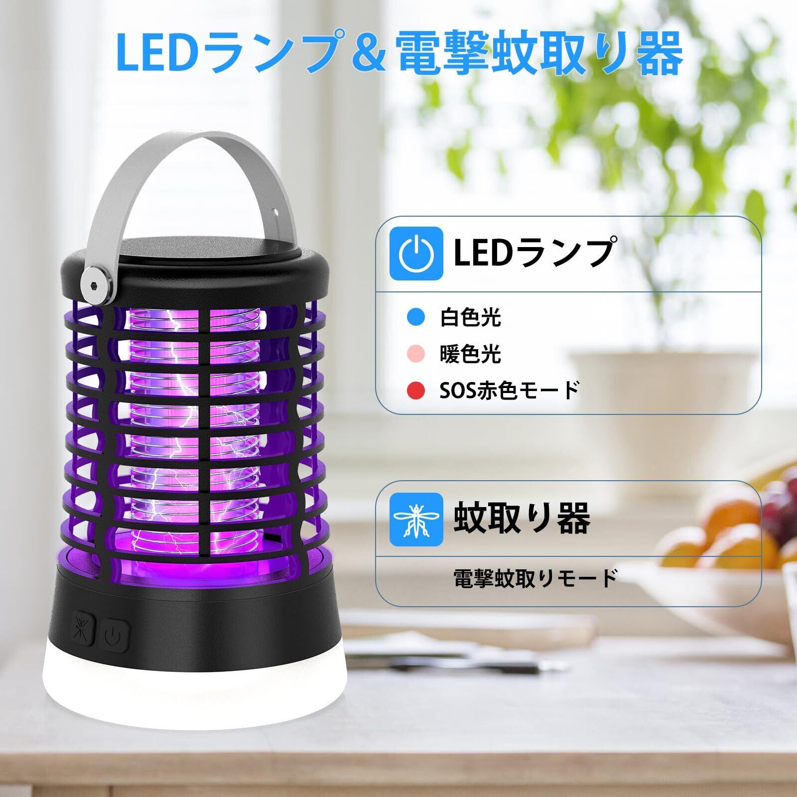 【在庫限り】電撃殺虫器 蚊取り 屋外 殺虫灯 コバエ取り 防水 捕虫器 充電式 吊り下げ&置き両用 IPX6完全防水 3つライトモード UV光源誘引式 薬剤不要 静音 省エネー 虫よけ 害虫対策 アウトドア/寝室/居間/台所/ホテル適用 2年