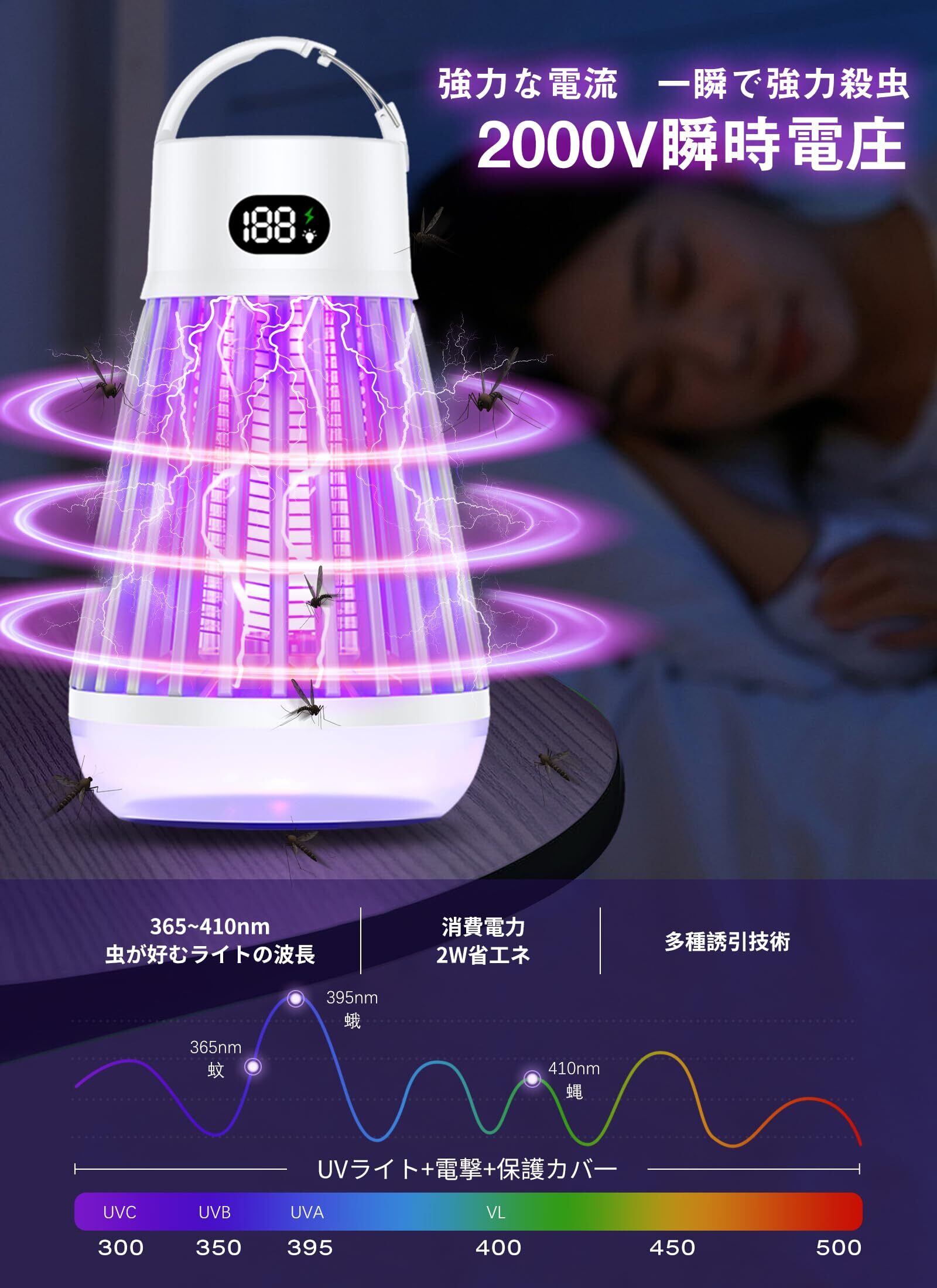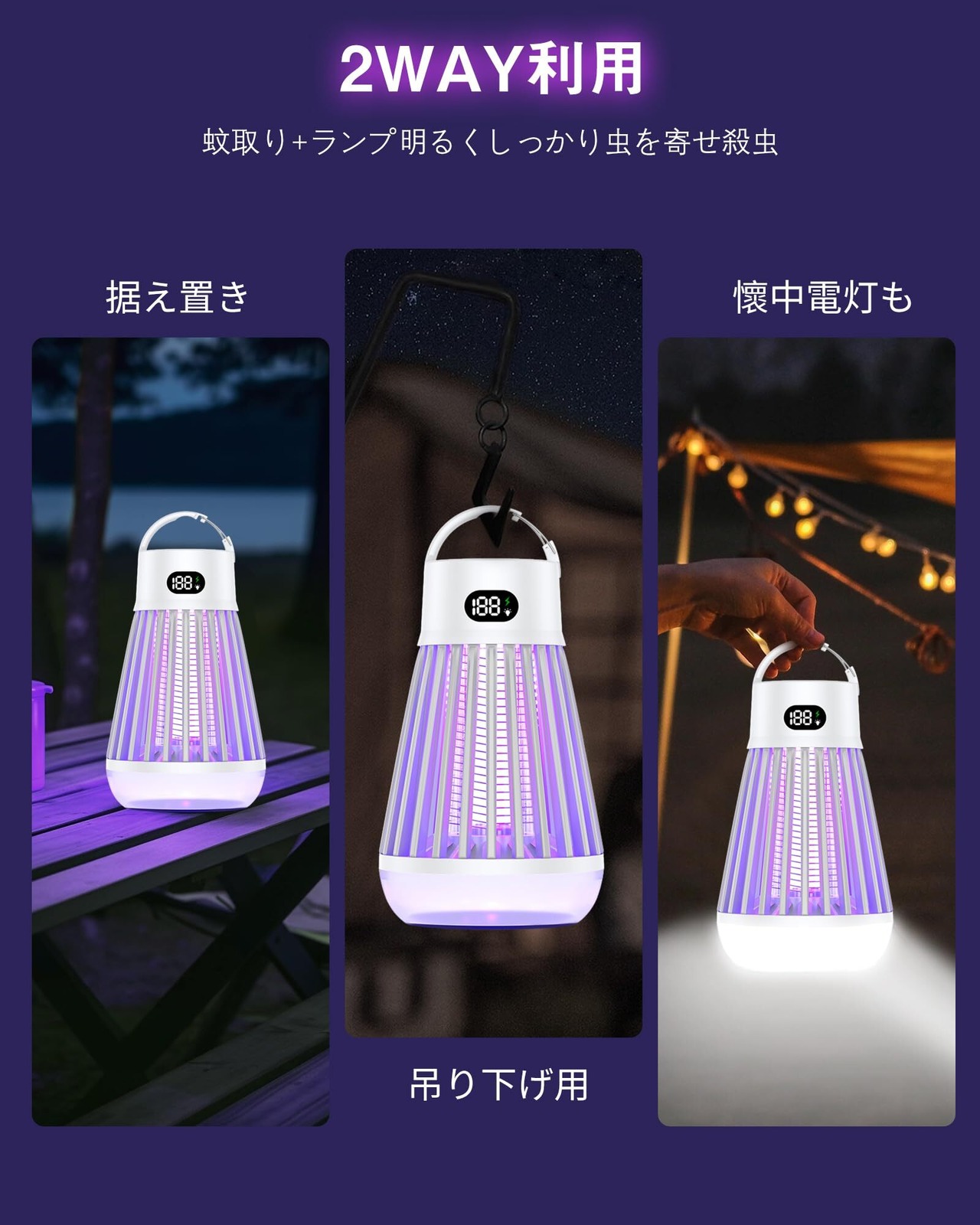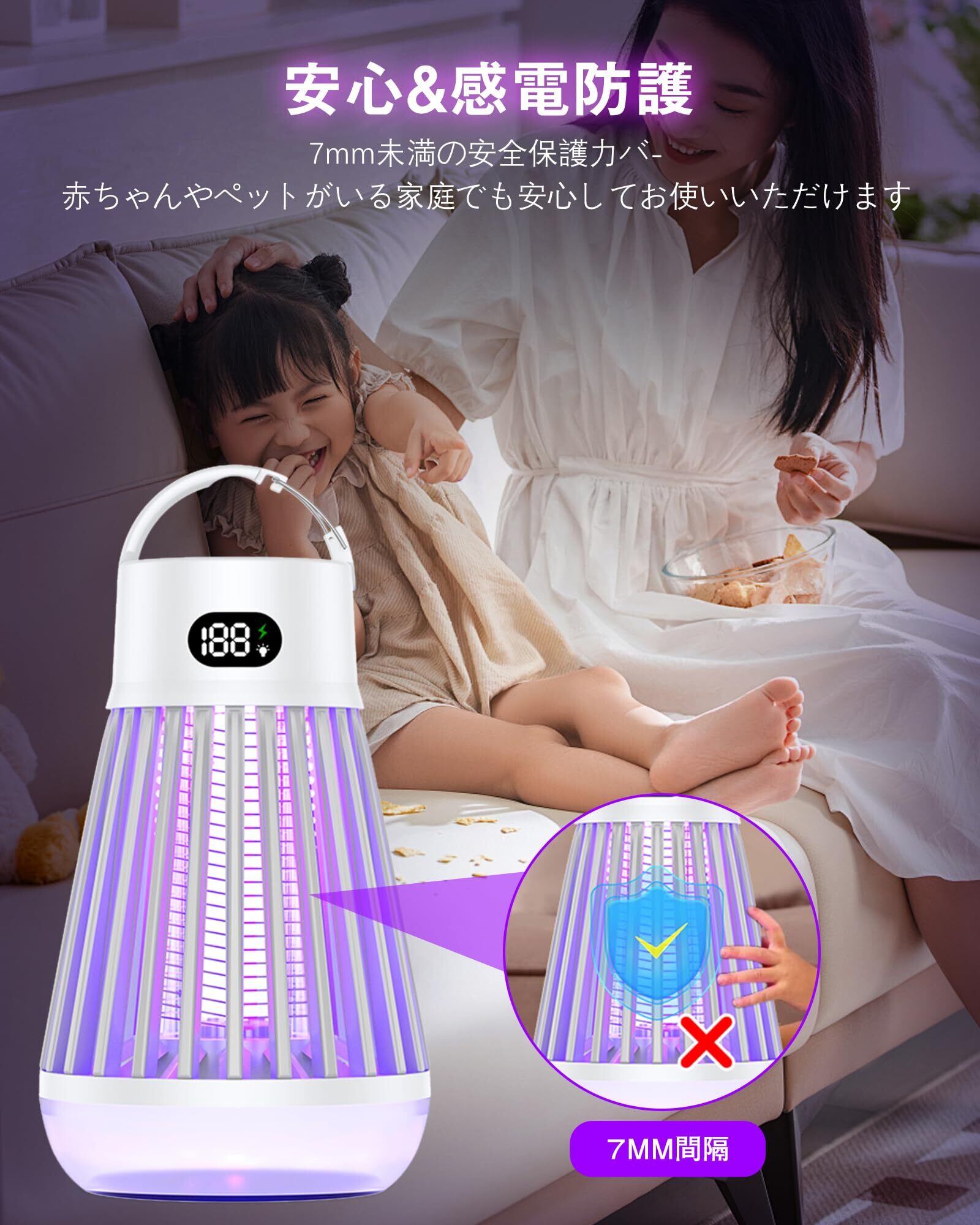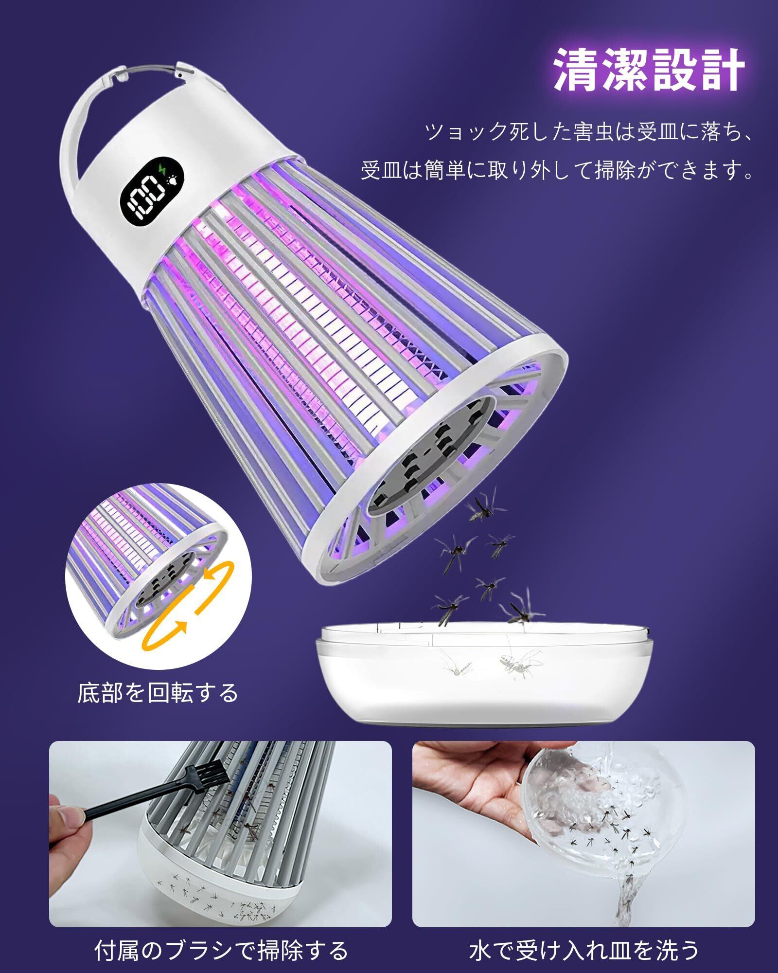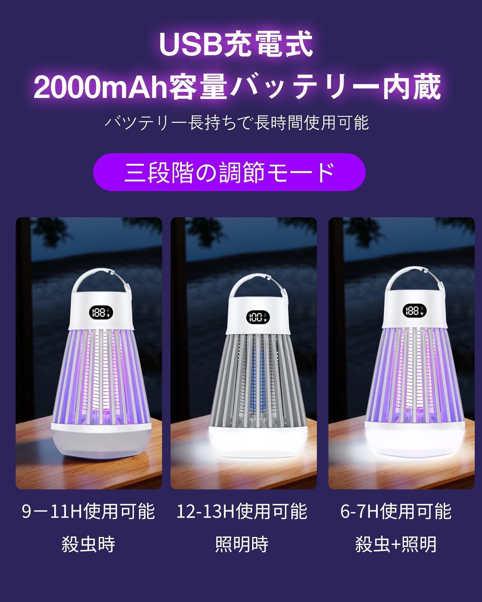 【IPX5防水性&吊り下げ·据え置き2way&三段階の調節モ一ド】IPX5防水性をお持ち、屋内屋外でもご安心に使用いただけます。吊り下げ式&据え置き式両用設計で、場所を取らずどこでも使える電気蚊取り器です。LEDランタン照明と電撃殺虫を同時利用することができます、殺虫モード、照明モード、殺虫+照明モードの3段階切り替えられるLED誘虫灯です。耐久性が優れています、オールシーズン使うことができます。蚊に刺されない、安心で眠れる睡眠環境を作ってくれます。