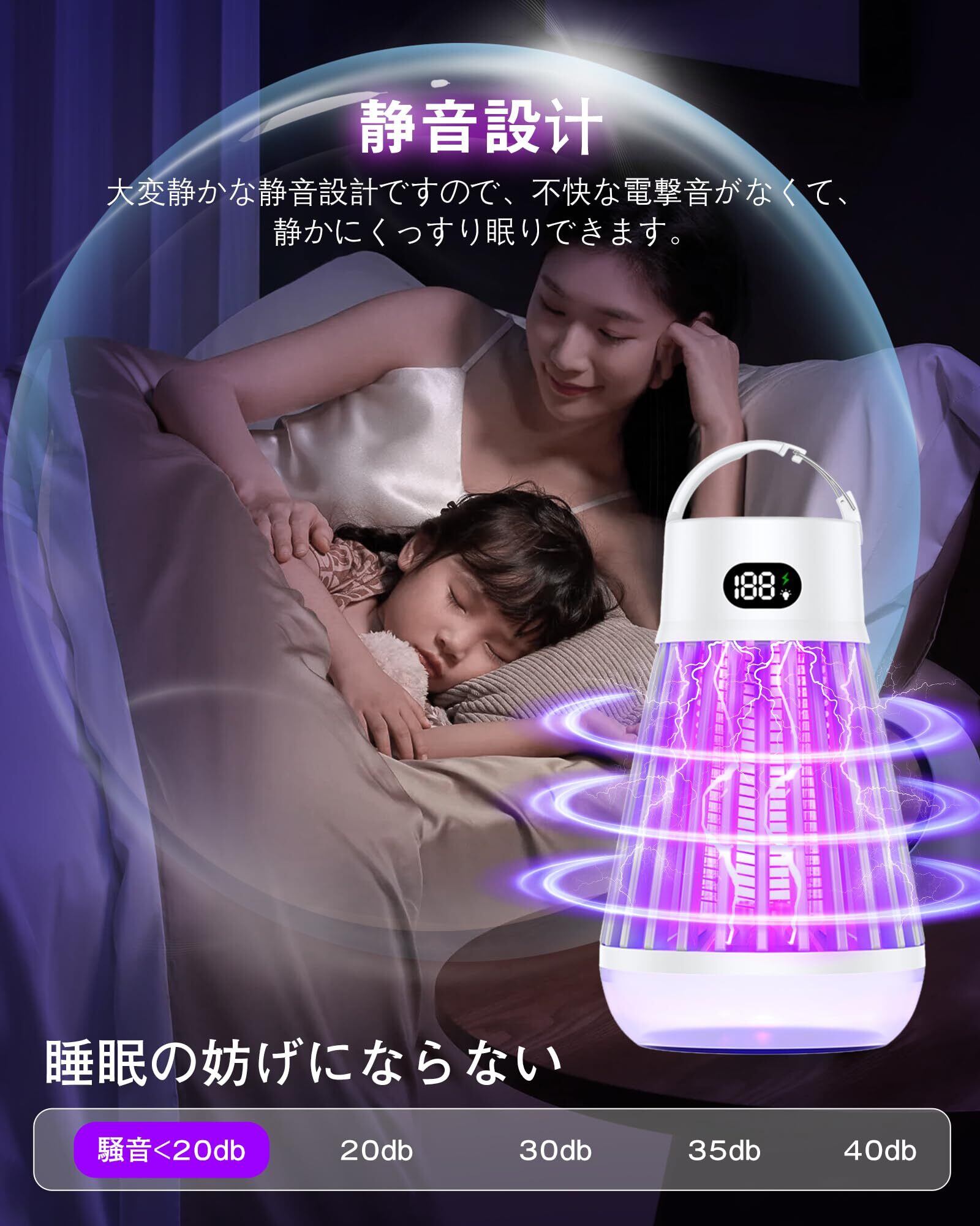 【USB充電式&静音設計&省エネ】この電撃蚊取りのフル電力の場合は最大が10時間の使用が可能です、大容量2000mAHリチウムバッテリーを内蔵します。2Wの消費電力で省エネルギー、一晩中つけっぱなしでも電気代は経済的です。本品の稼働音は20db以下で、静音効果抜群の電子蚊取り器は、快適な睡眠を実現するための理想的な選択肢です。
