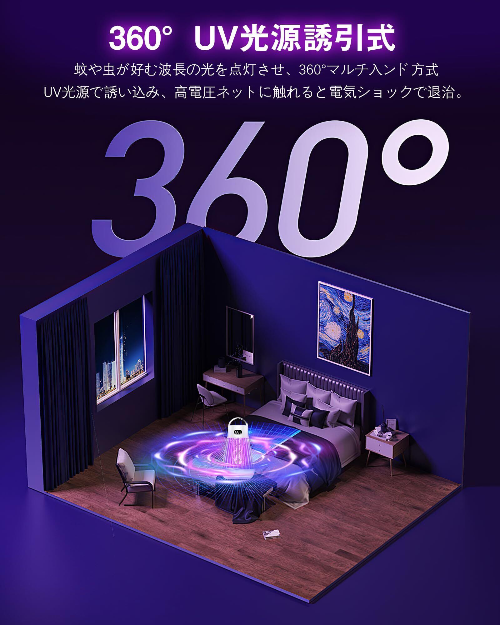 【360度全面退治&UV光源吸引式】補虫蛍光管を内蔵し、360°全方位スキャナーしたりして虫を引き付けることができます。吊り下げ式&据え置き式両用設計で、場所を取らずどこでも使える電気蚊取り器です。私達の蚊取り器はUV紫光ランプの灯玉を採用して、周囲に365- 410mmの波長(蚊を誘い込む波長)を出すことができ。普通の捕虫器より誘虫力3倍向上!また、蚊、ハエ、蛾などの羽虫の大小や種類を問わず誘引される。
