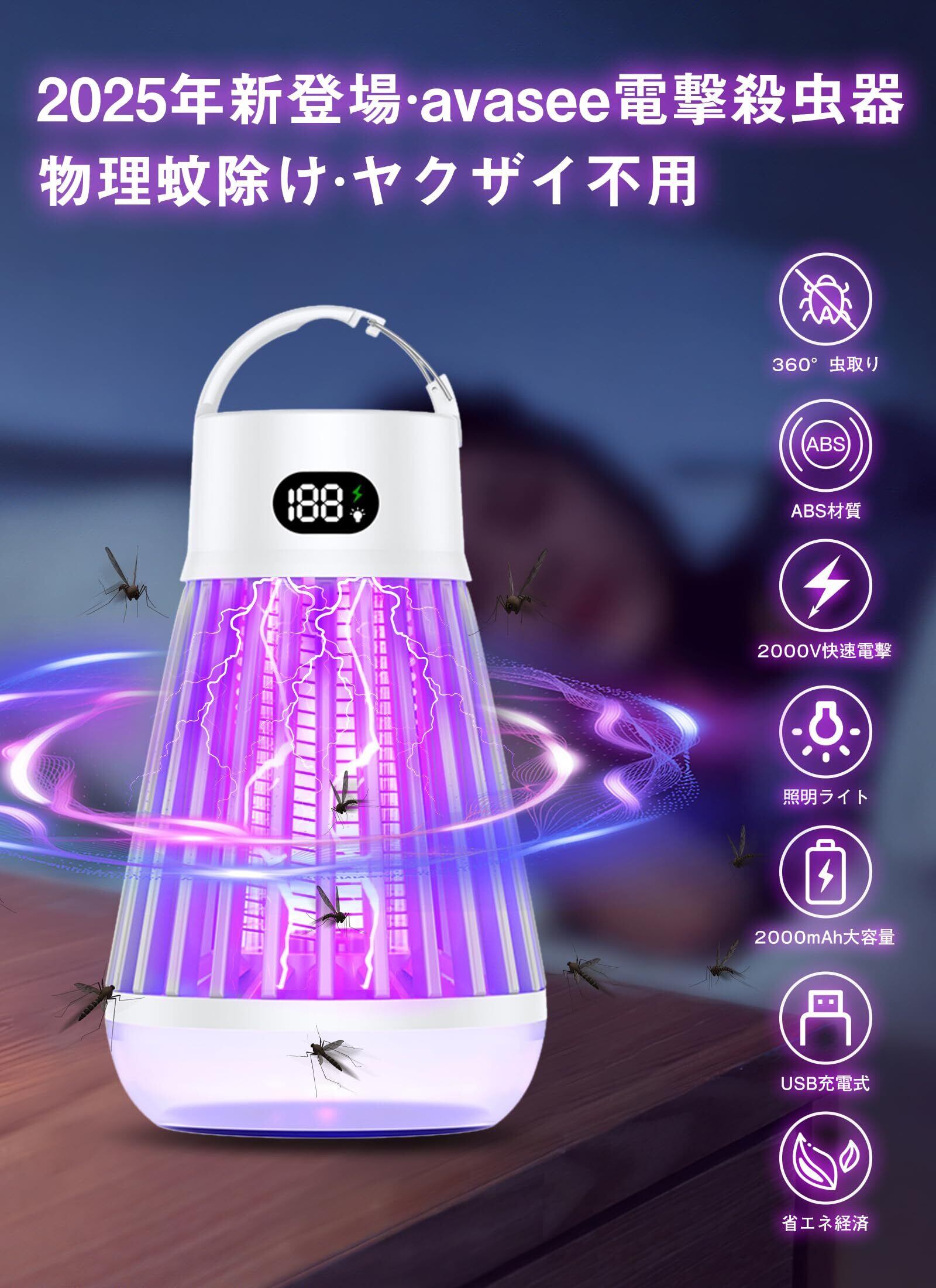 avasee電撃殺虫器 コバエ取り【殺虫&照明3段階調節モード&省エネ】蚊取り器 誘虫灯 害虫退治 uv光源誘引式 410nm波長 360°強力蚊除け スイッチ付き 静音 防水 ヤクザイ不要 防虫 室内/屋外 人体無害 吊り下げ式&据え置き式両用 手入れ簡単 掃除ブラシ付き(ホワイト)