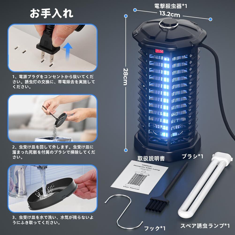 お手入れ簡単:ショック死した害虫は受け皿に落ち、受け皿は簡単に取り外して掃除できます。一つのスペア誘虫ランプ(11W)が付いて、ランプの寿命が来た時はランプを交換できます。ご注意:お手入れする前に、必ず電源を抜いていることを確認してください。