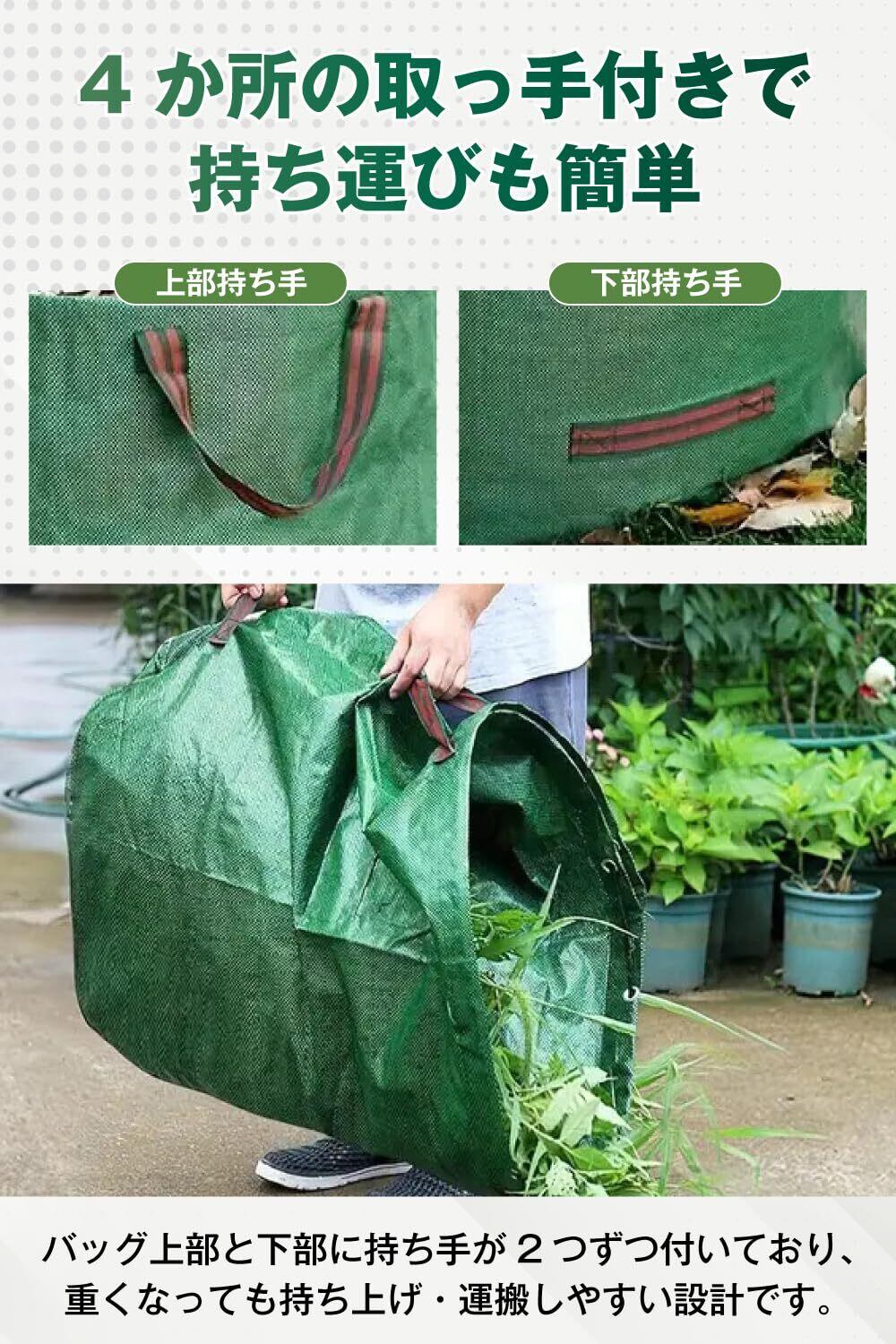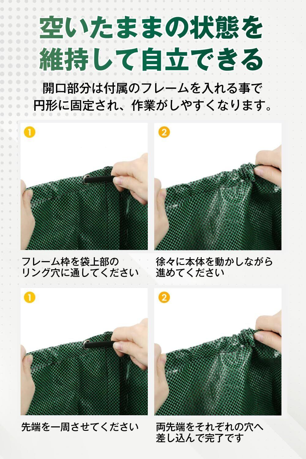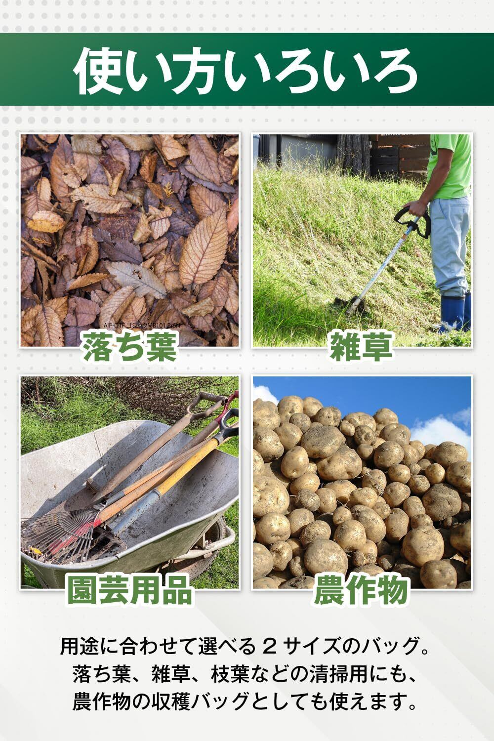 幅広い用途に対応。落ち葉、雑草、剪定枝の処理。園芸用品の収納や運搬。農作物(じゃがいも、玉ねぎなど)の収穫バッグにも!