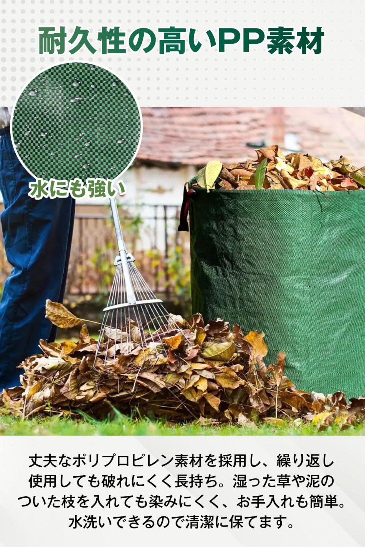 タフで 丈夫なPP素材&水にも強い!破れにくいポリプロピレン素材を採用。湿った草や泥のついた枝葉も気にせずポンポン入れられます。丸ごと水で流して洗ってOKでお手入れ簡単。