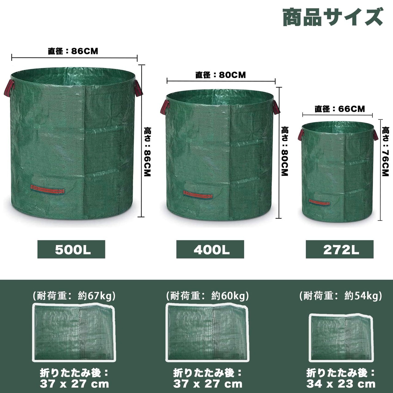 【選べる大容量サイズ・庭仕事の強い味方】272L / 400L / 500L の大容量サイズをご用意。落ち葉、芝、枝、雑草など、かさばる庭ゴミを一気に収納可能。作業効率が大幅アップし、繰り返しの収集や処分の手間を削減します。
