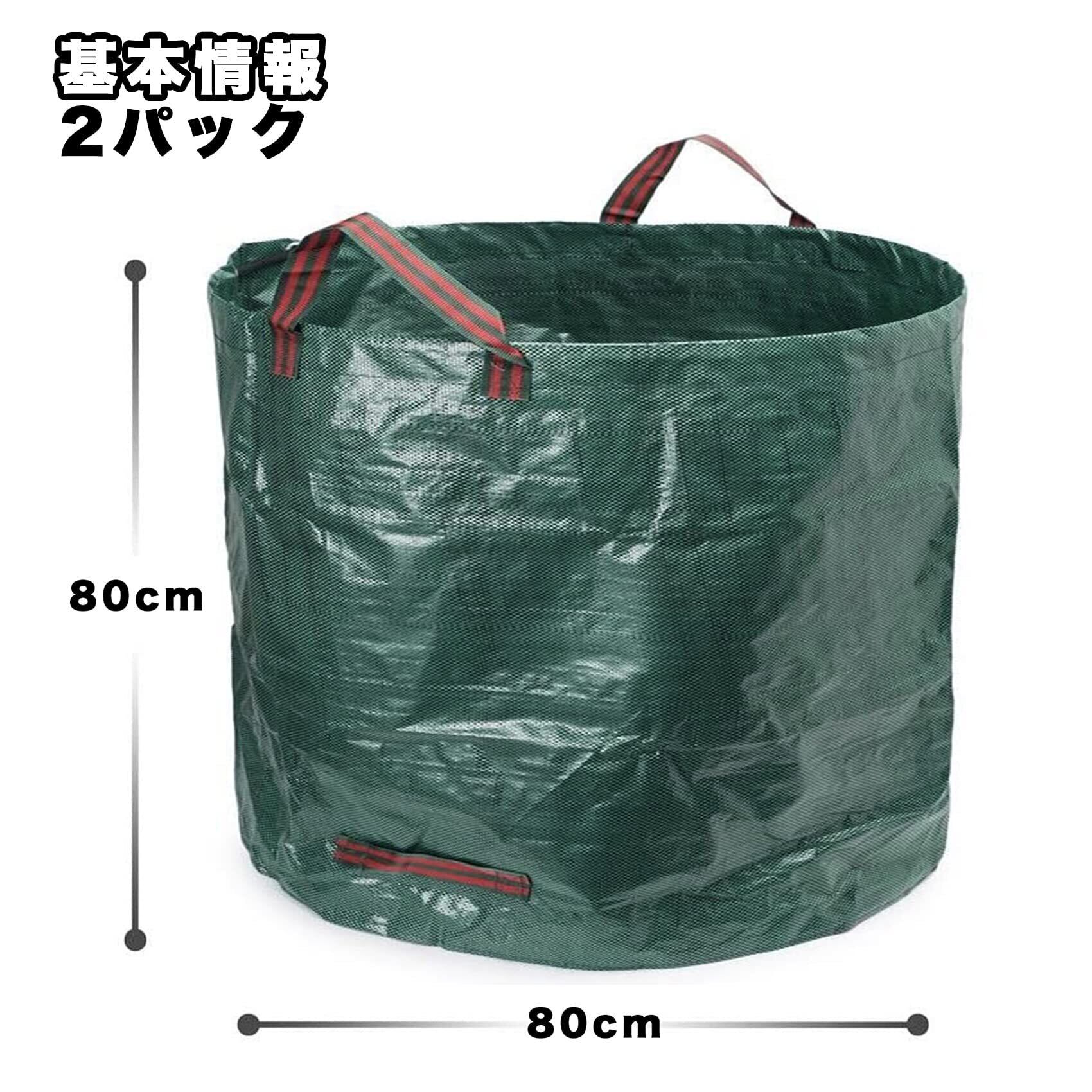 【基本情報】2ガーデンバッグのセット - 最大容量(各袋)の400L - 高さ80cm直径80cm - バッグあたり79kgの最大重量。 安定性を高め、袋を開いた状態に保つための柔軟なフープを含めることで、塗りつぶしやすく、空きやすい。素材:ポリプロピレン 色:緑。