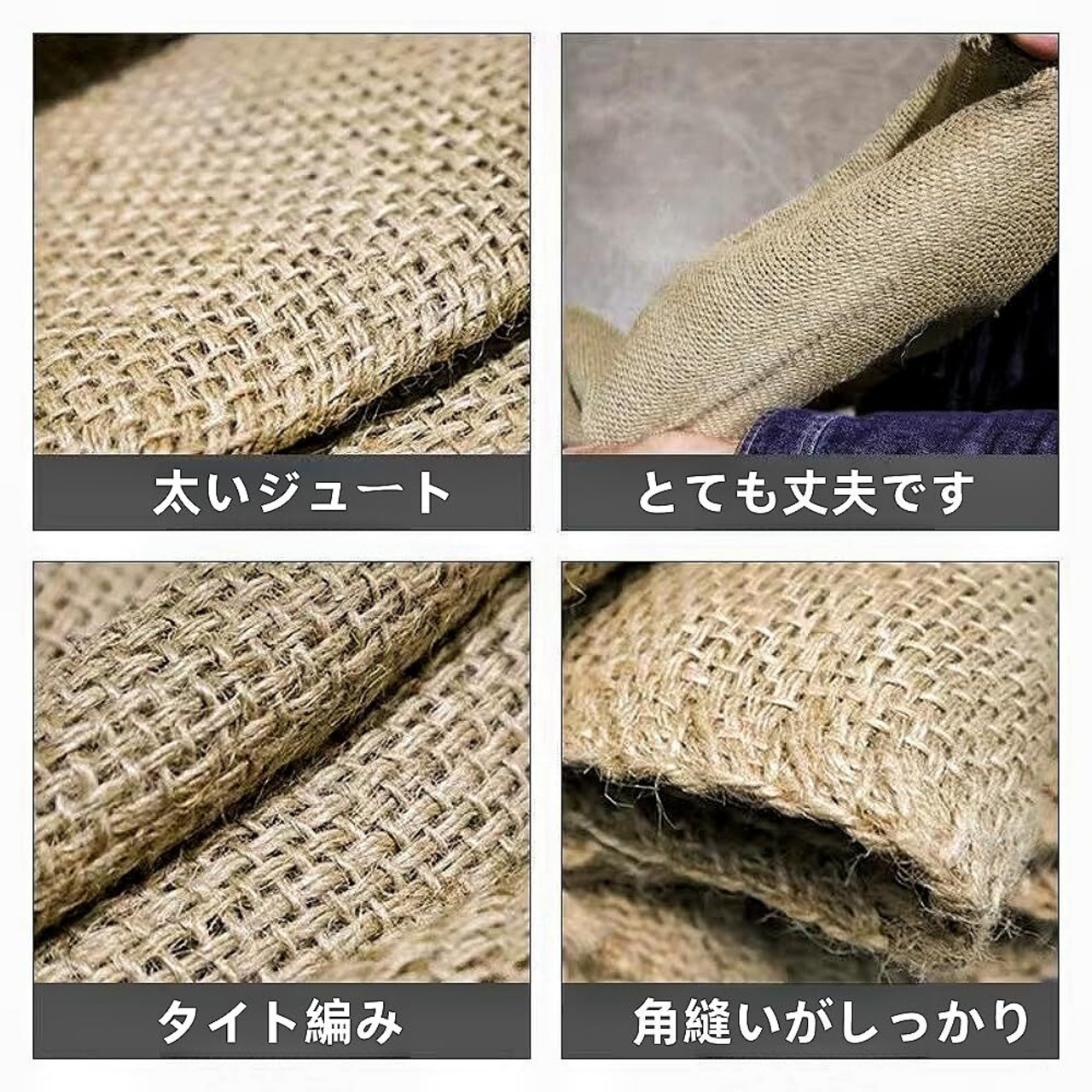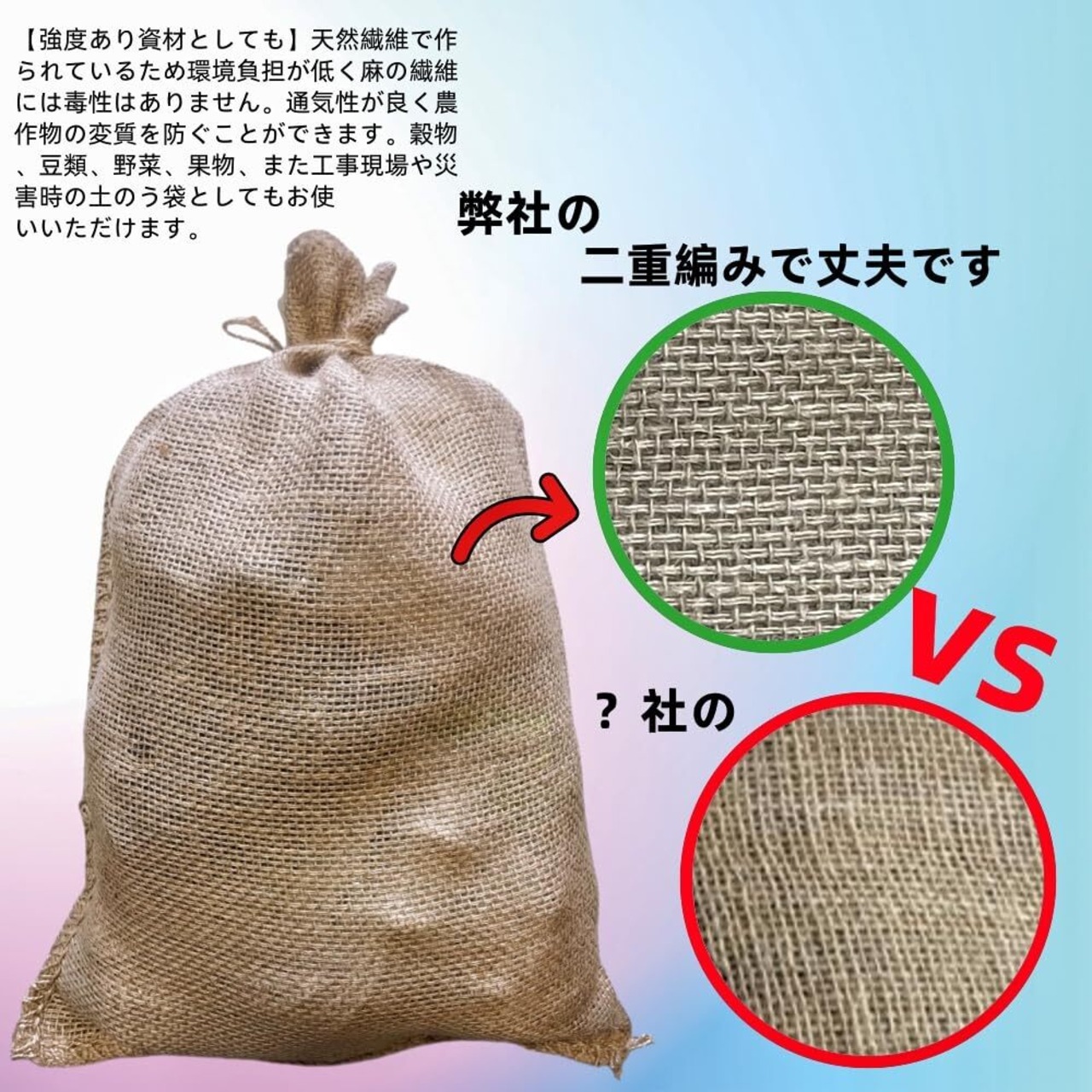 【天然繊維素材】麻袋は、天然繊維素材で作られています。麻の特性を活かし、通気性が良く、湿気やカビの発生を抑えます。また、天然素材ならではの丈夫さと耐久性があり、長期間の使用にも耐えます。