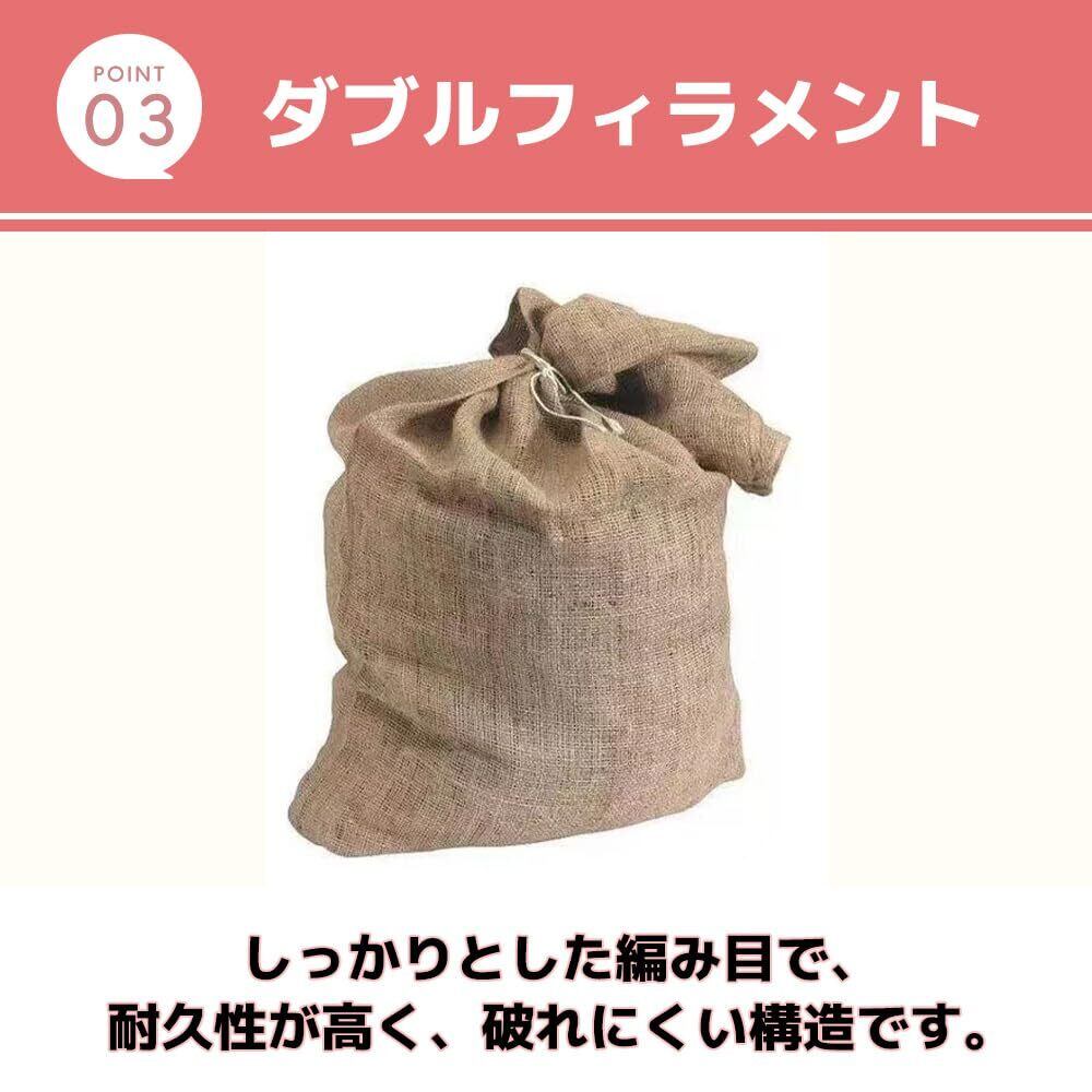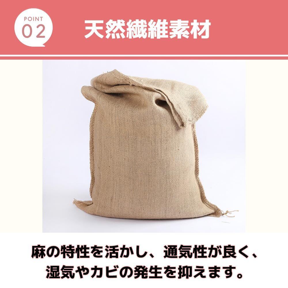 【天然繊維素材】麻袋は、天然繊維素材で作られています。麻の特性を活かし、通気性が良く、湿気やカビの発生を抑えます。また、天然素材ならではの丈夫さと耐久性があり、長期間の使用にも耐えます。
