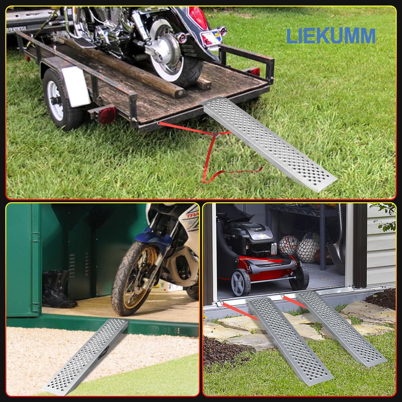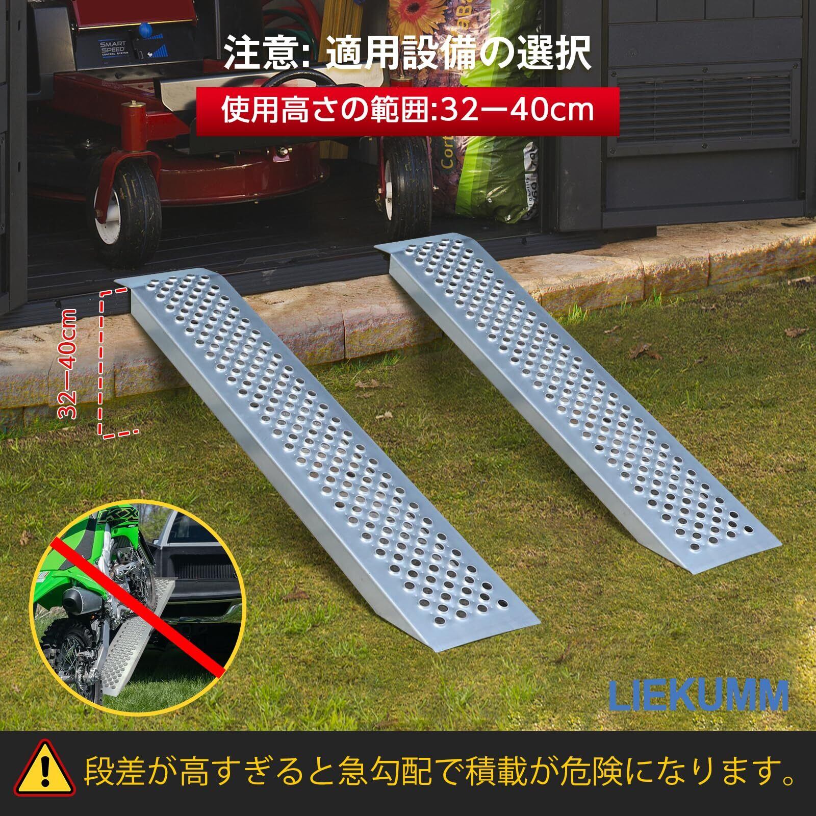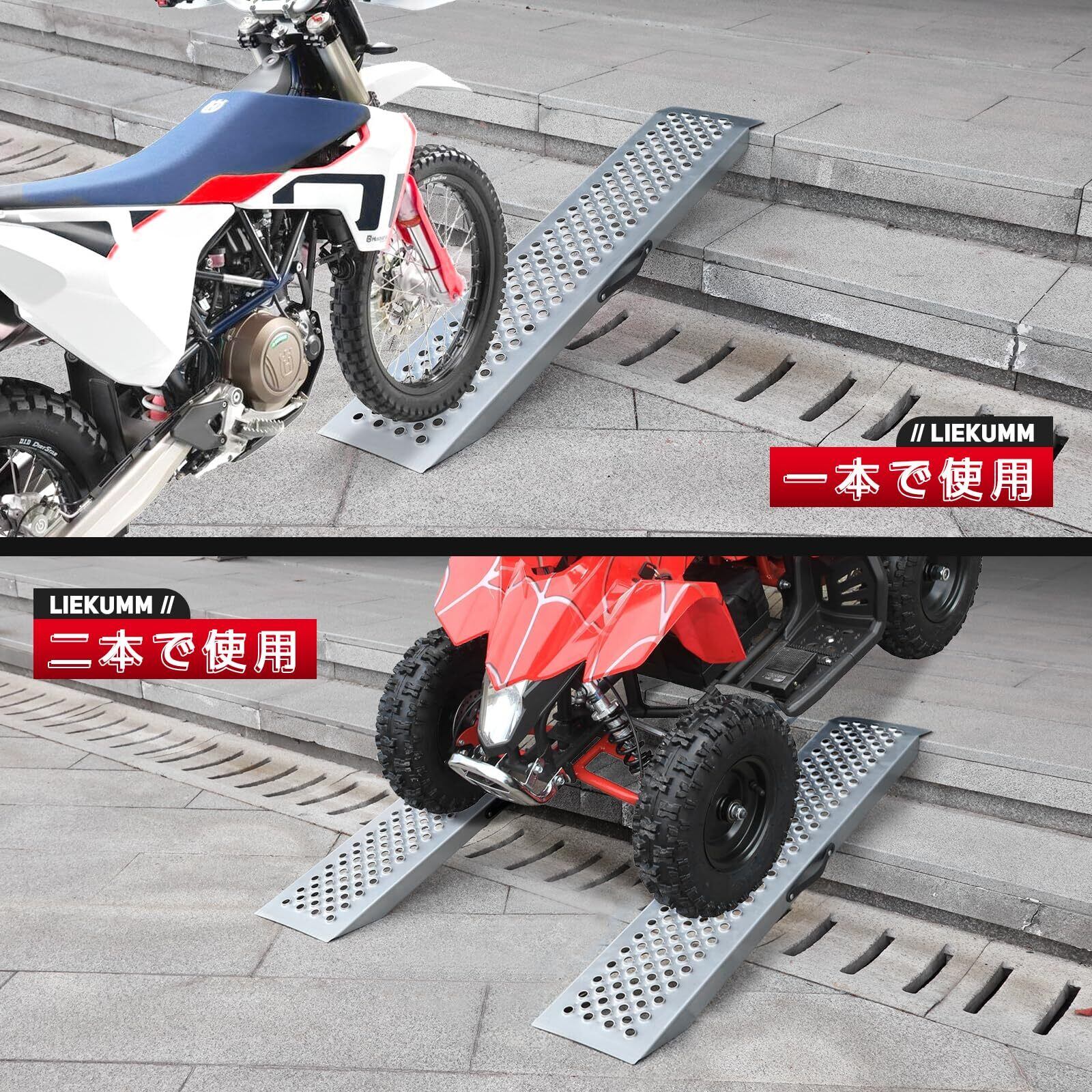 幅広い用途:本スロープは、バイク、ATV四輪バギー、芝刈り機、手押し車、除雪機など、さまざまな車両や機器の積載に対応しています。軽トラやトレーラーへの積み込みにも最適です。
