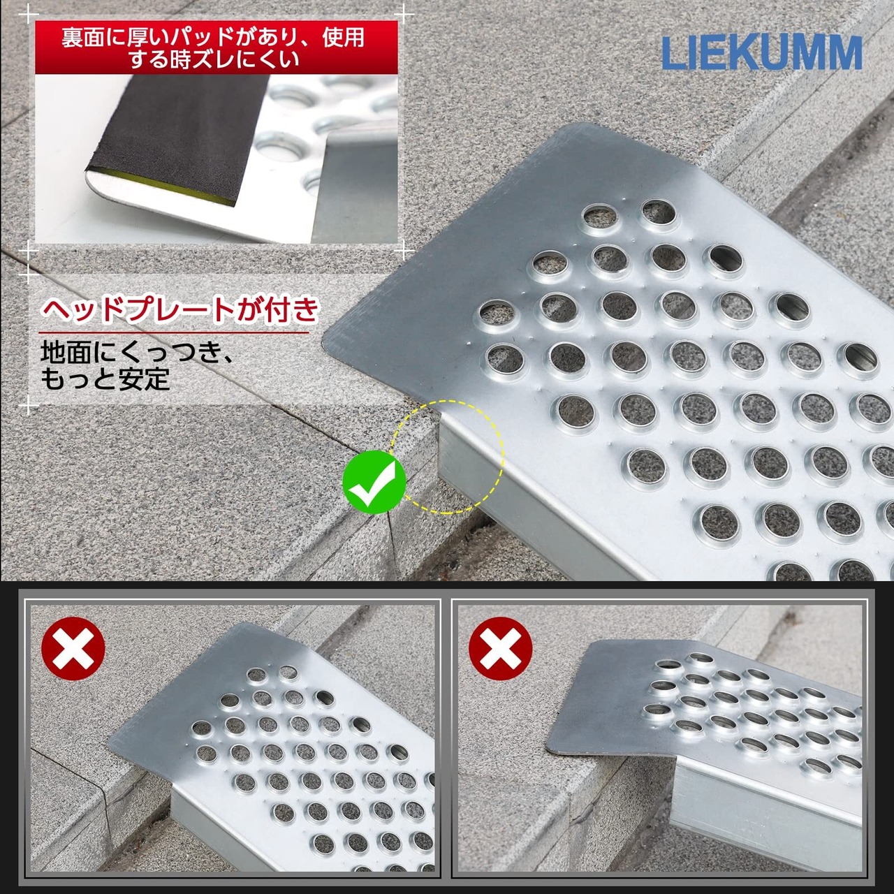 優れた滑り止め性能:バイラダー表面にはポンチ穴が加工されており、高い滑り止め効果を発揮します。さらに、付属の固定用ストラップを使用することで、スロープが使用中にズレにくく、より安全にご使用いただけます。