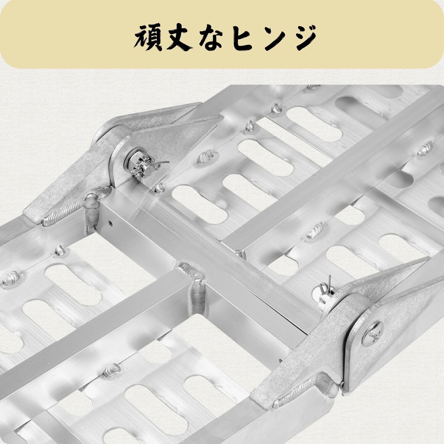 ①【ロング&ワイドで高耐荷重】 全長約226cm×幅30.5cmのロング&ワイド設計です。1本あたり耐荷重340kgと余裕のあるスペックで、中型〜大型バイクの積み降ろしにも対応します。同じラダーを2本使用すれば最大約680kgまで載せられるため、ATVや小型農機など重量のあるマシンにも安心です。
