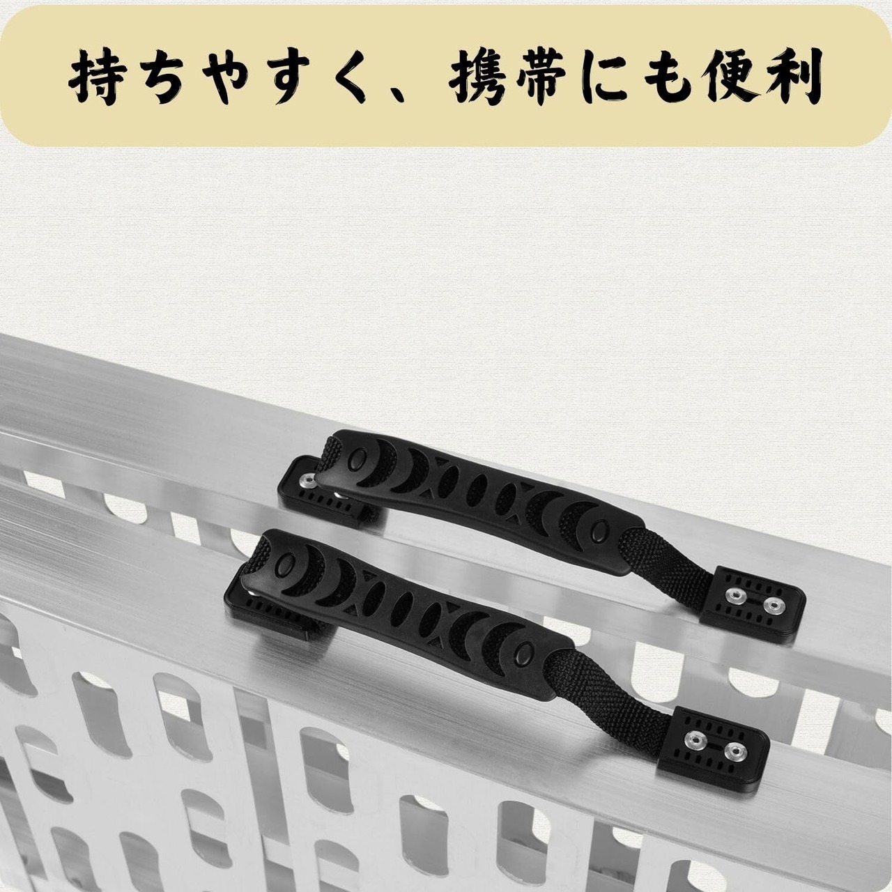 ④【折りたたみ式で省スペース収納】 使用時サイズは約226cm×30.5cm×7.5cm、折りたたみ時は約117cm×30.5cm×15cmとコンパクトになります。荷台の横やガレージの隙間にも収まり、車に積みっぱなしにしても邪魔になりません。トランポ・ツーリング・現場仕事など、持ち運びにも便利です。