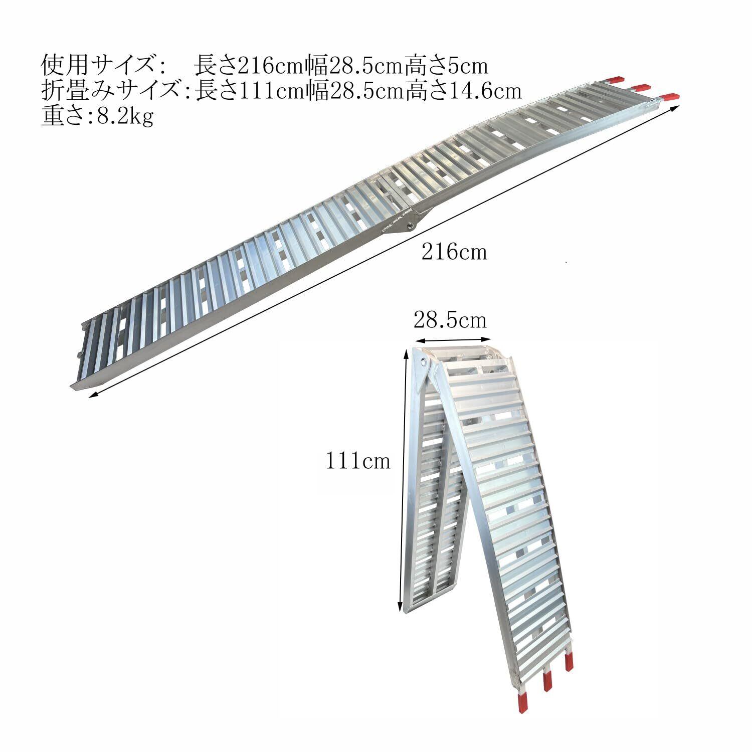 バイク用 アルミ ラダー アルミブリッジ 長さ216cm*幅28.5cm アルミプレート強度強化 耐荷重340kg 折り畳み式 アルミラダーレール アルミラダー 頑丈 サブベルト付き