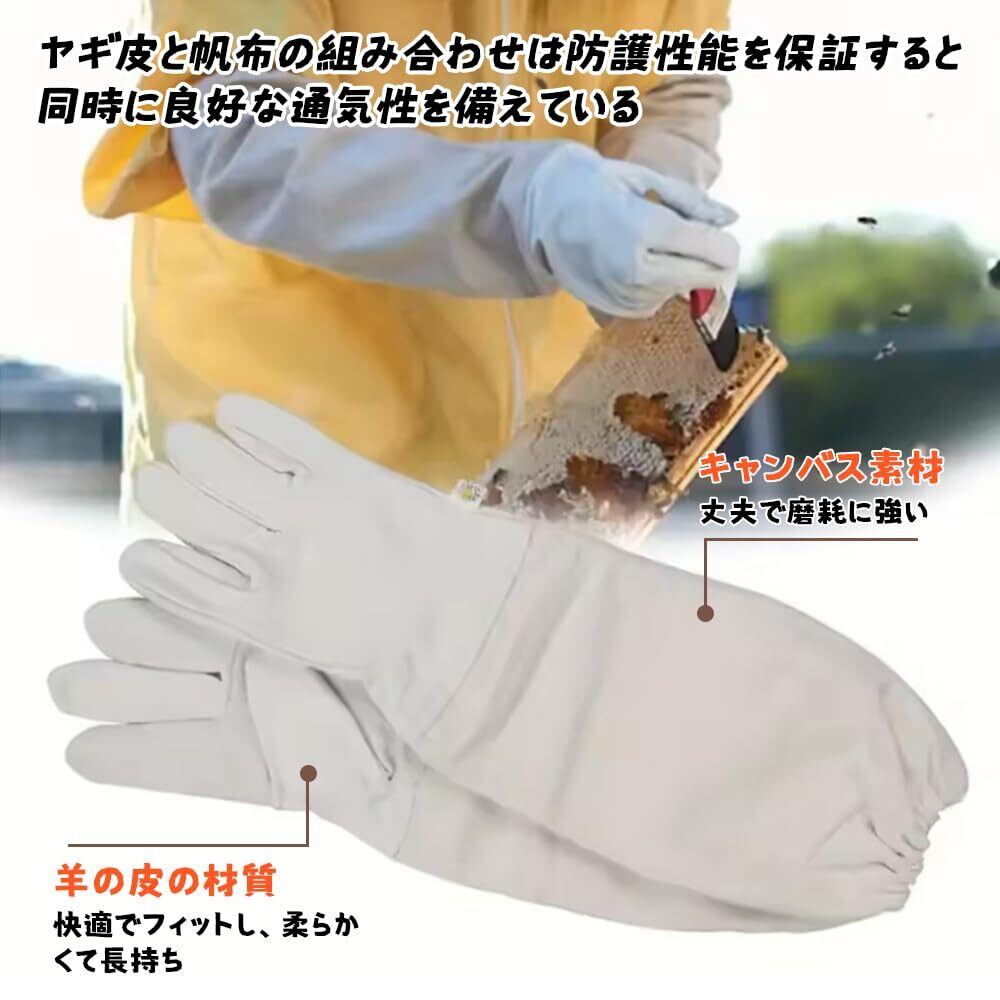 【良質な材質】手のひら部分は柔らかいヤギの皮を選び、快適にフィットし、柔軟で耐久性があり、帆布部分は丈夫で耐摩耗性があり、全体の使用寿命を向上させ、専門家とアマチュア養蜂家の理想的な選択である。