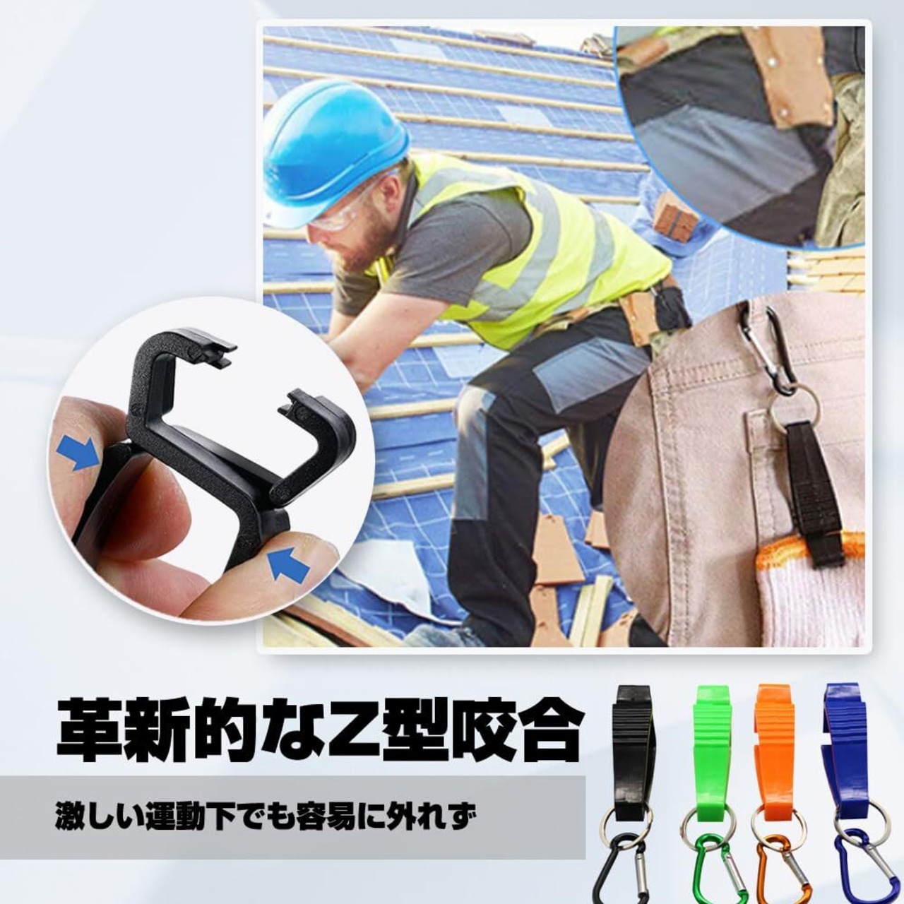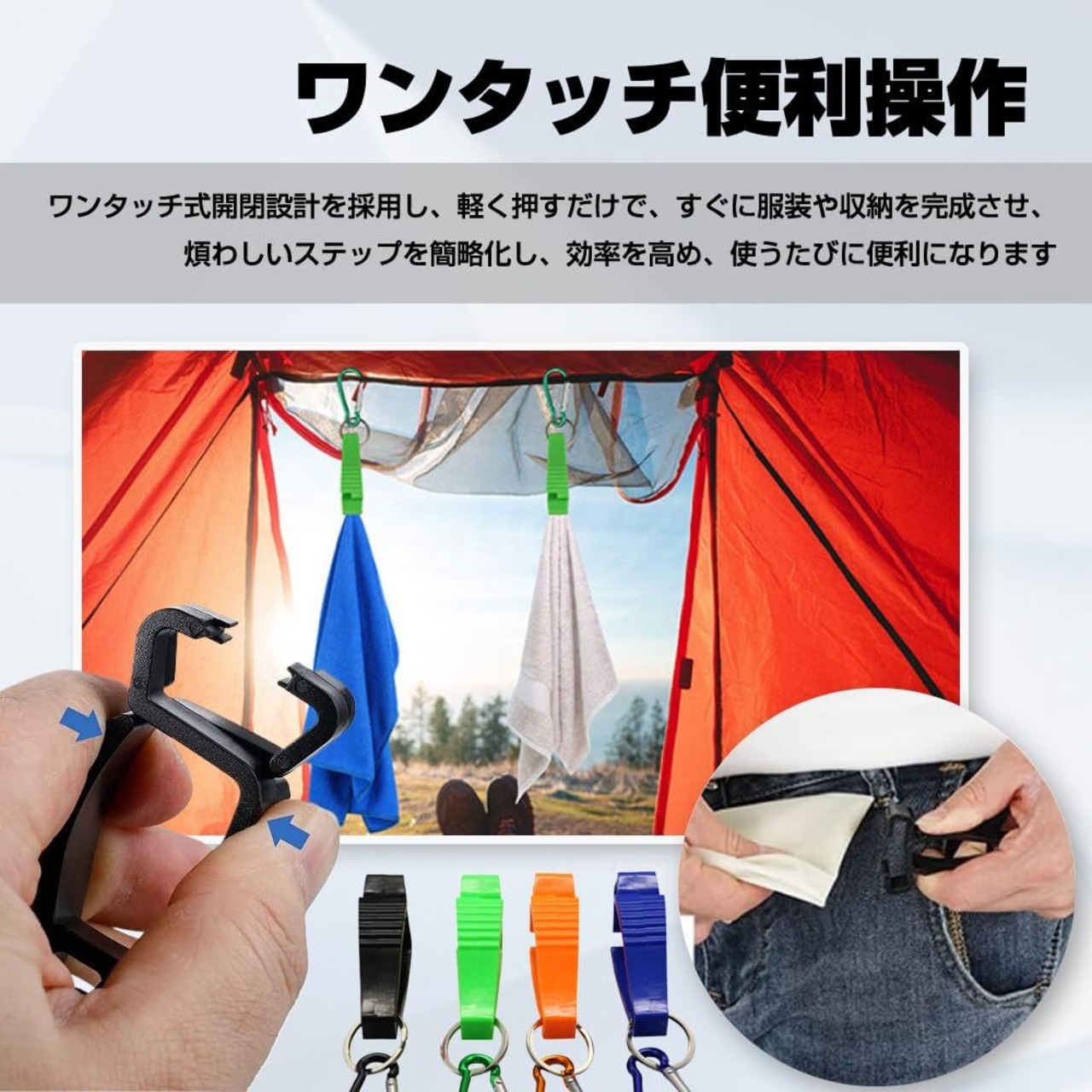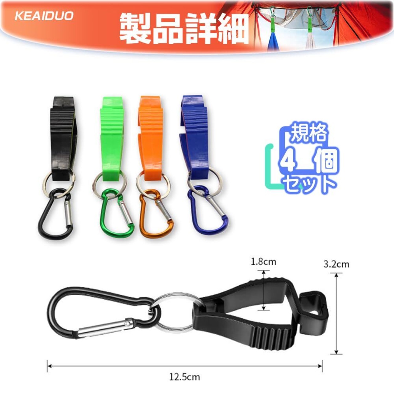 【360°回転】製品は360°自由回転機能を搭載し、使用の柔軟性を大幅に向上させ、腰にかけてもリュックにかけても、最も快適な位置に簡単に調整でき、手袋、タオルなどの物品の紛失を効果的に防止する。