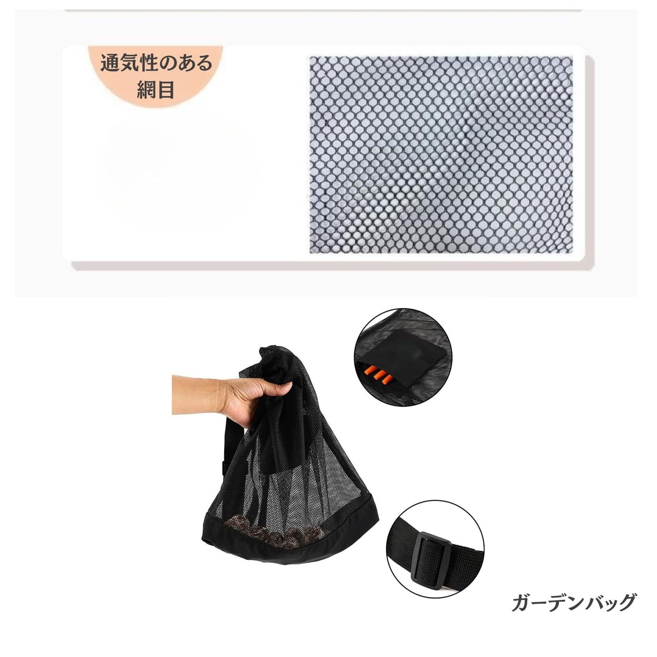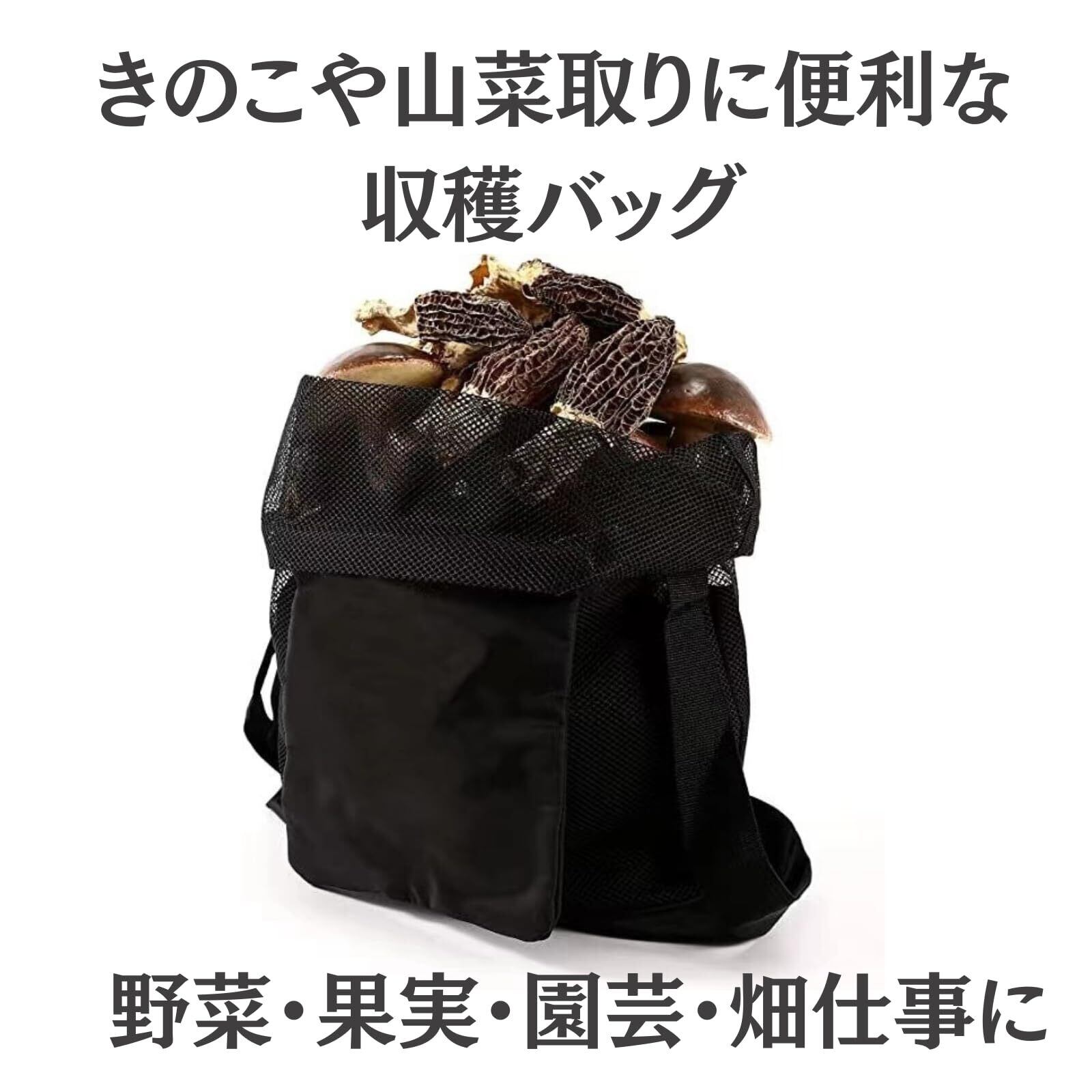 2. 大容量&通気性抜群の「網」タイプで、鮮度をキープ たくさんの山菜や果実を一度に運びたい時も安心の大容量サイズです。通気性の良い網状の素材なので、収穫したての野菜や果実を蒸れさせることなく、新鮮な状態を保ちます。また、土や葉っぱなどのゴミが自然と落ちるため、持ち帰った後の片付けも楽になります。