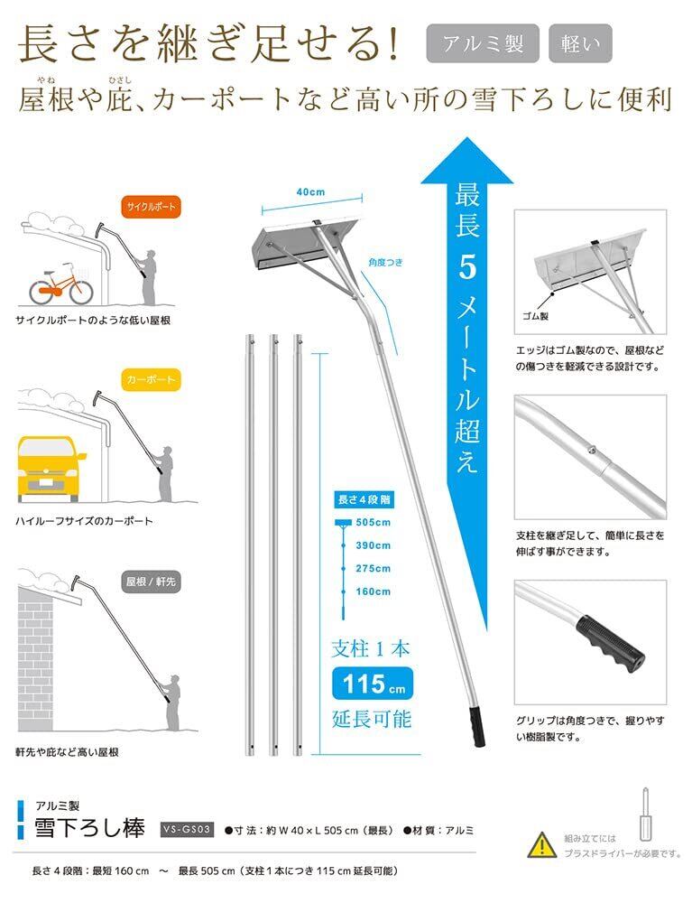 雪下ろし棒 VS-GS03 最長5m アルミ製 簡単 軽量 軽い 雪かき 雪おろし 雪降ろし 雪落とし 屋根