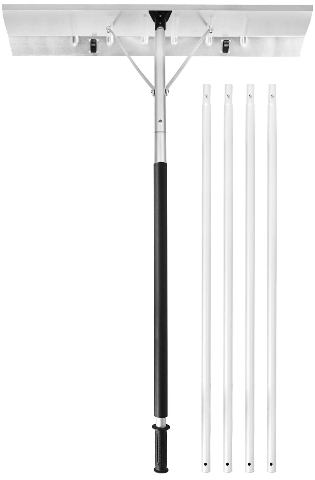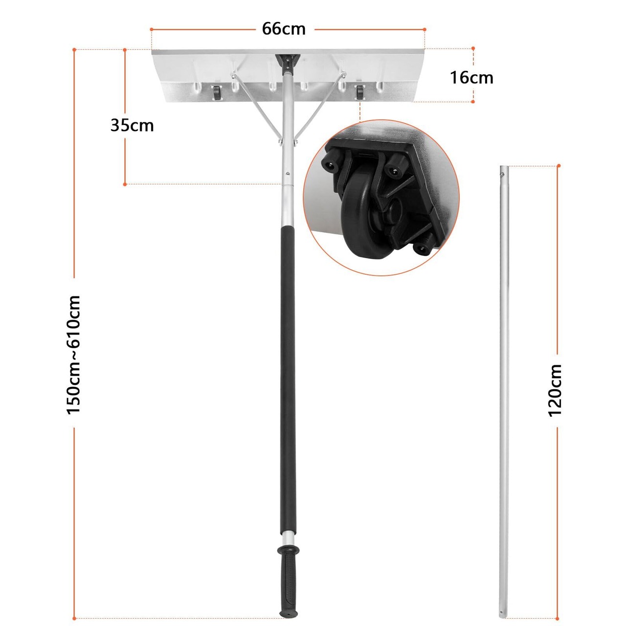 柔軟な操作のための調整可能なハンドル:スノーレーキのハンドルの長さは、ニーズに応じて1.48メートルから6.1メートルの間で自由に調整でき、さまざまな高さの屋根に適しており、使用せずに屋根の中央やフロントガラスに簡単に到達できます。はしごの。この設計により、冬の間、さまざまな高さの雪を効率的に除雪できるため、理想的な除雪ツールとなります。